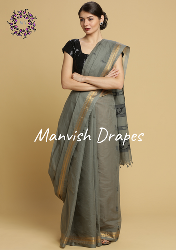Kanchi Cotton Sarees with Buttas all over and Zari Tissue Borders on both sides (GREY)
