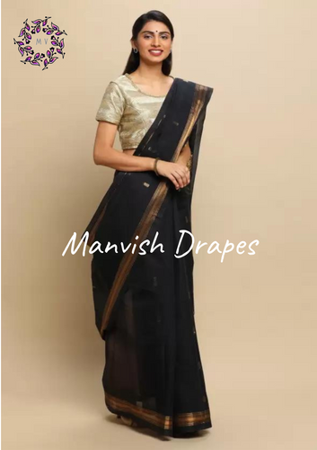 Kanchi Cotton Sarees with Buttas all over and Zari Tissue Borders on both sides (BLACK WITH ZARI BUTTAS)
