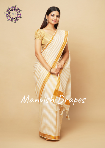 Kerala Kasavu Pure Cotton Saree with Zari stripes body (GOLD ZARI)