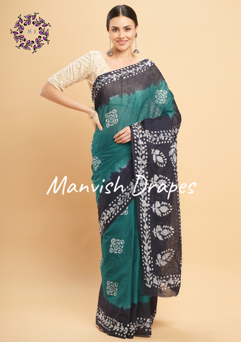 Mul Mul Pure Cotton Saree with Tie N Dye and Batiq Prints (NAVY BLUE-RAMA COMBINATION)