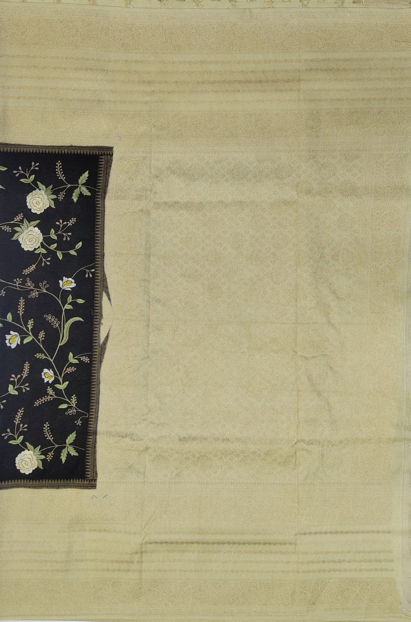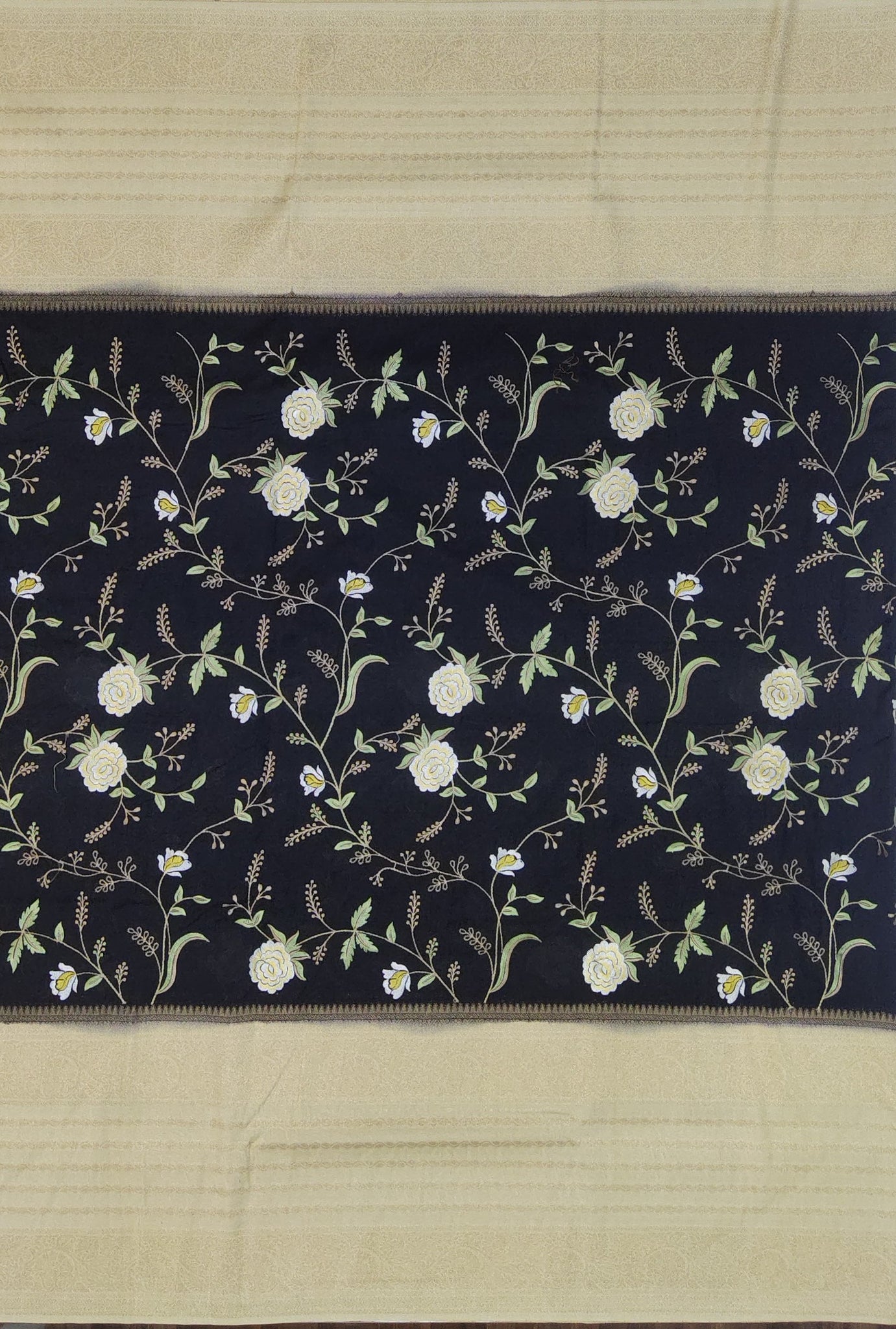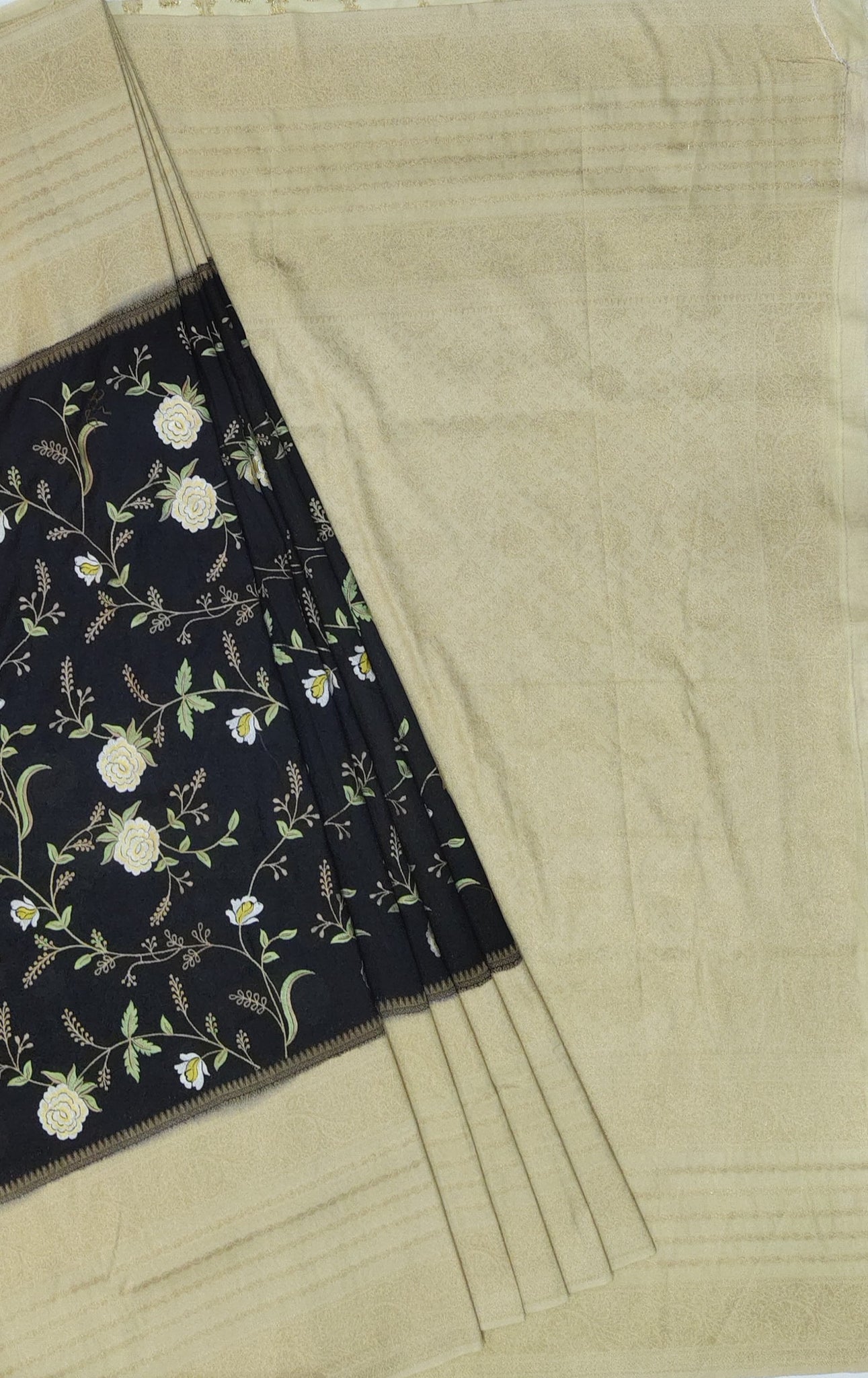 Banaras Crepe Saree with Kashmiri Thread work with Contrast Border,Pallu and Butti Blouse(Black-Off White combination)