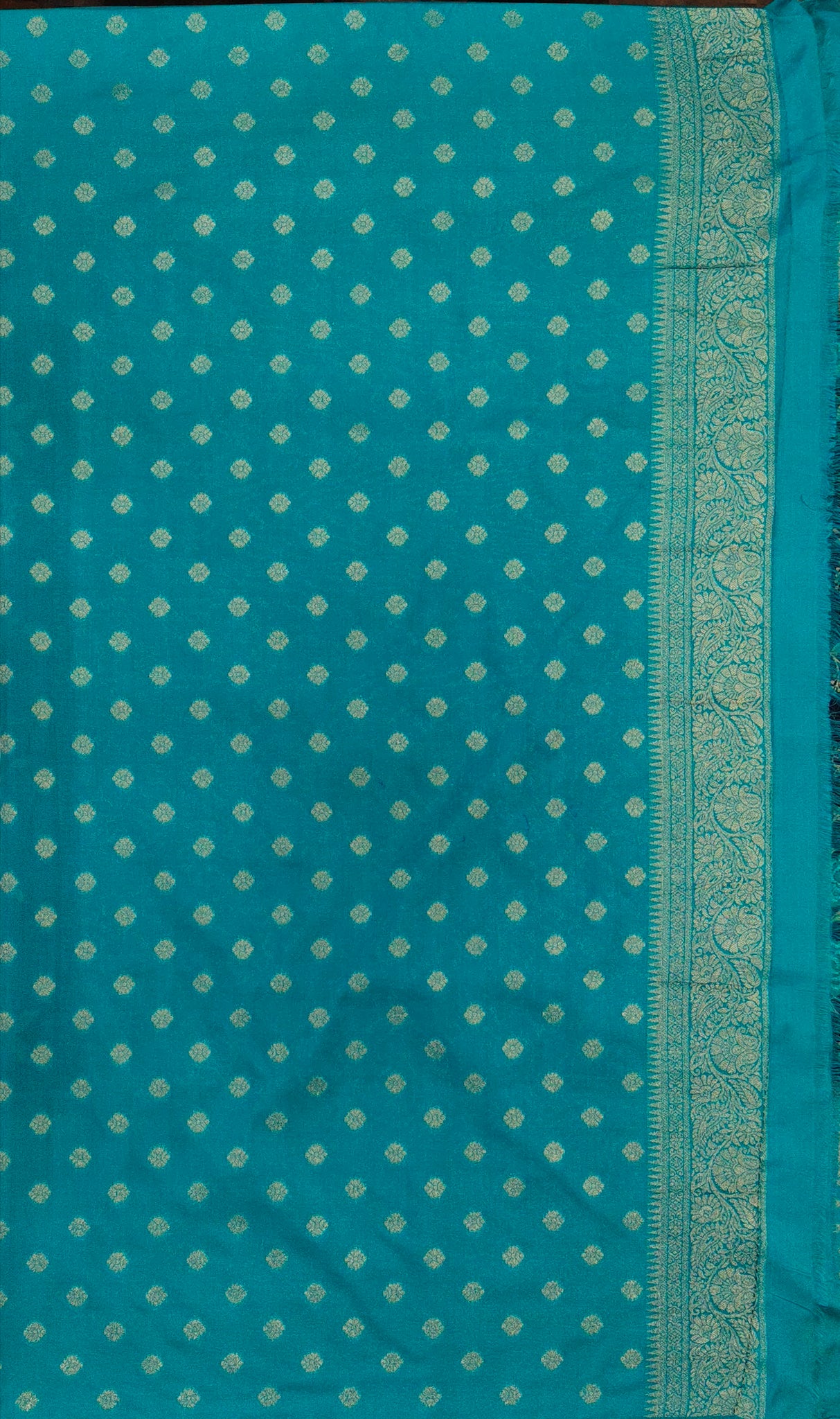 Elevate your ensemble with this Banaras Crepe Saree, exquisitely adorned with delicate Kashmiri thread work. The contrasting border and pallu add a refined touch of elegance, while the intricately designed butti blouse completes the sophisticated look. Perfect for special occasions, this saree blends traditional craftsmanship with timeless style.