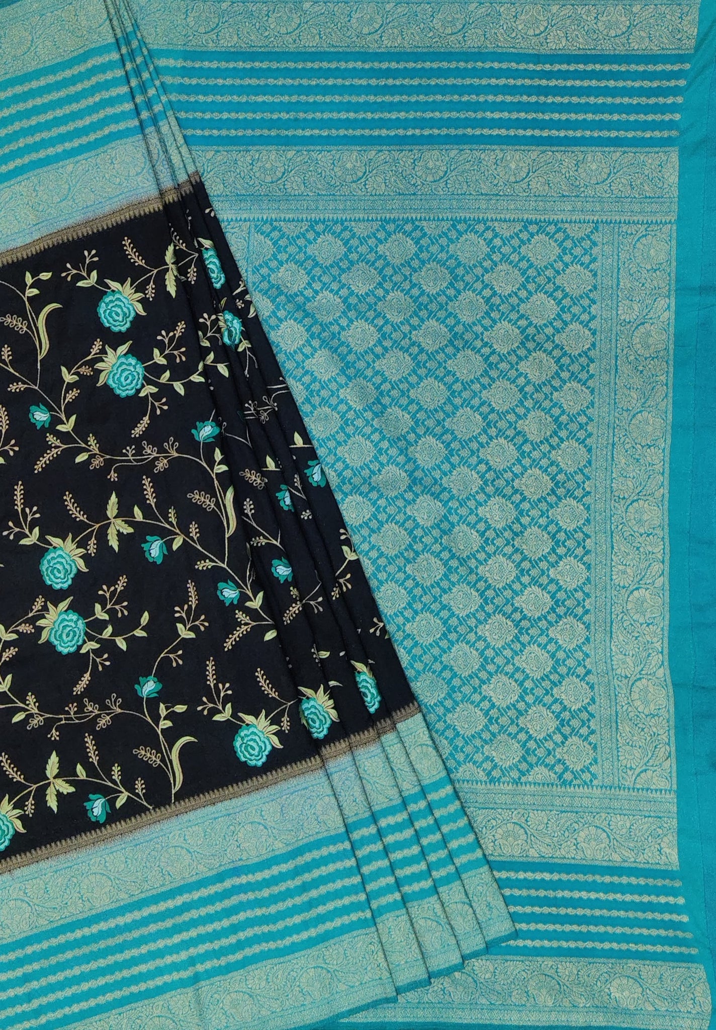 Banaras Crepe Saree with Kashmiri Thread work with Contrast Border,Pallu and Butti Blouse(Black-Sapphire combination)