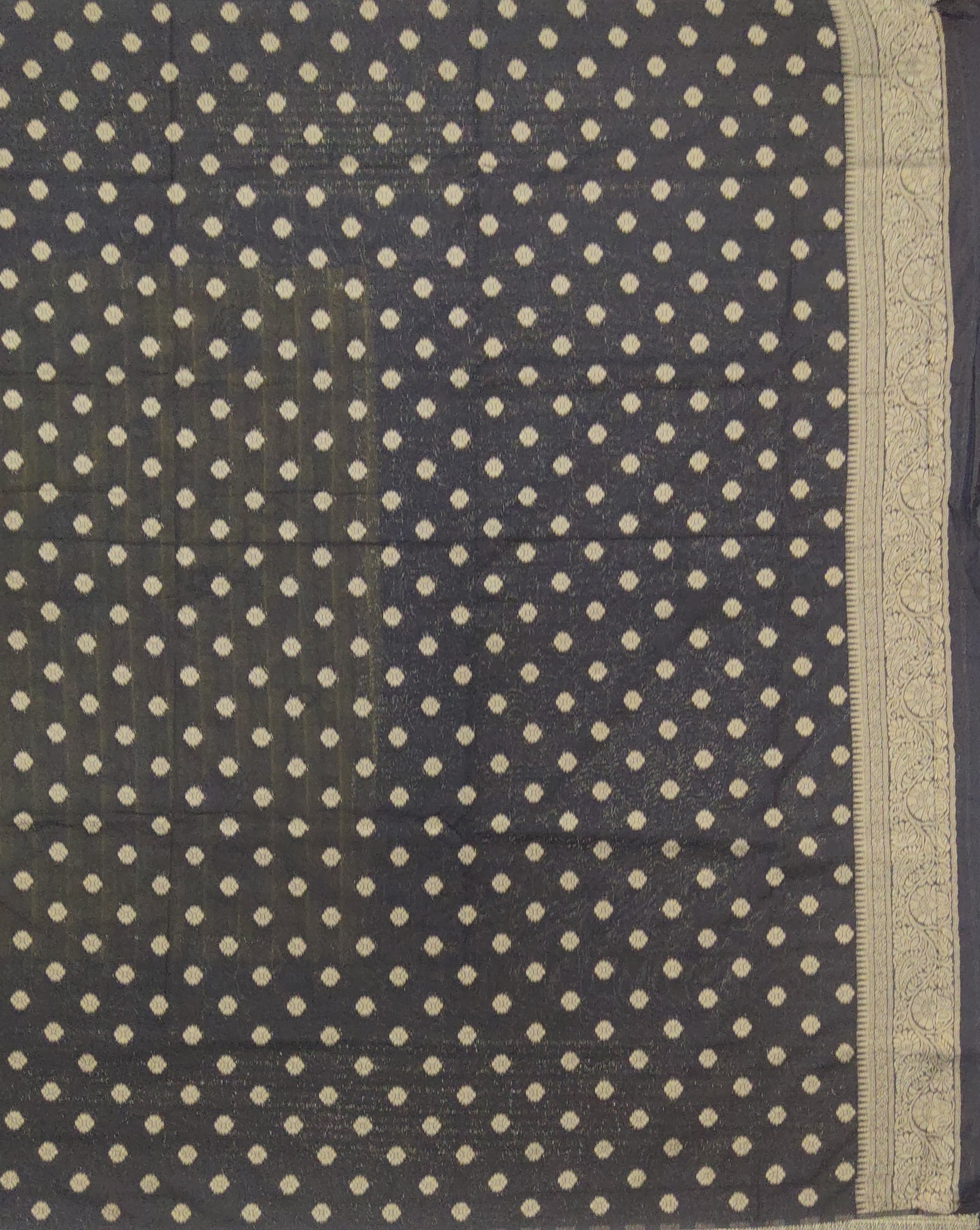 Elevate your ensemble with this Banaras Crepe Saree, exquisitely adorned with delicate Kashmiri thread work. The contrasting border and pallu add a refined touch of elegance, while the intricately designed butti blouse completes the sophisticated look. Perfect for special occasions, this saree blends traditional craftsmanship with timeless style.