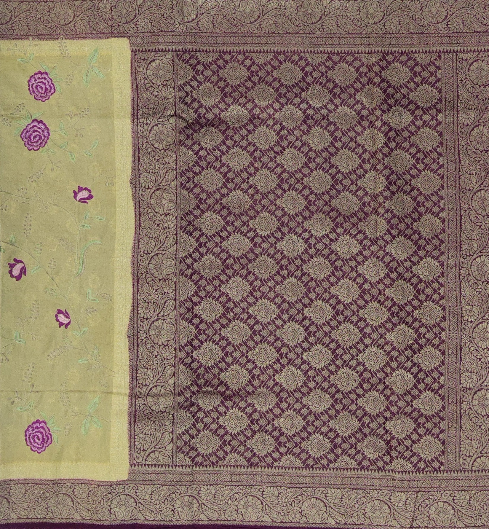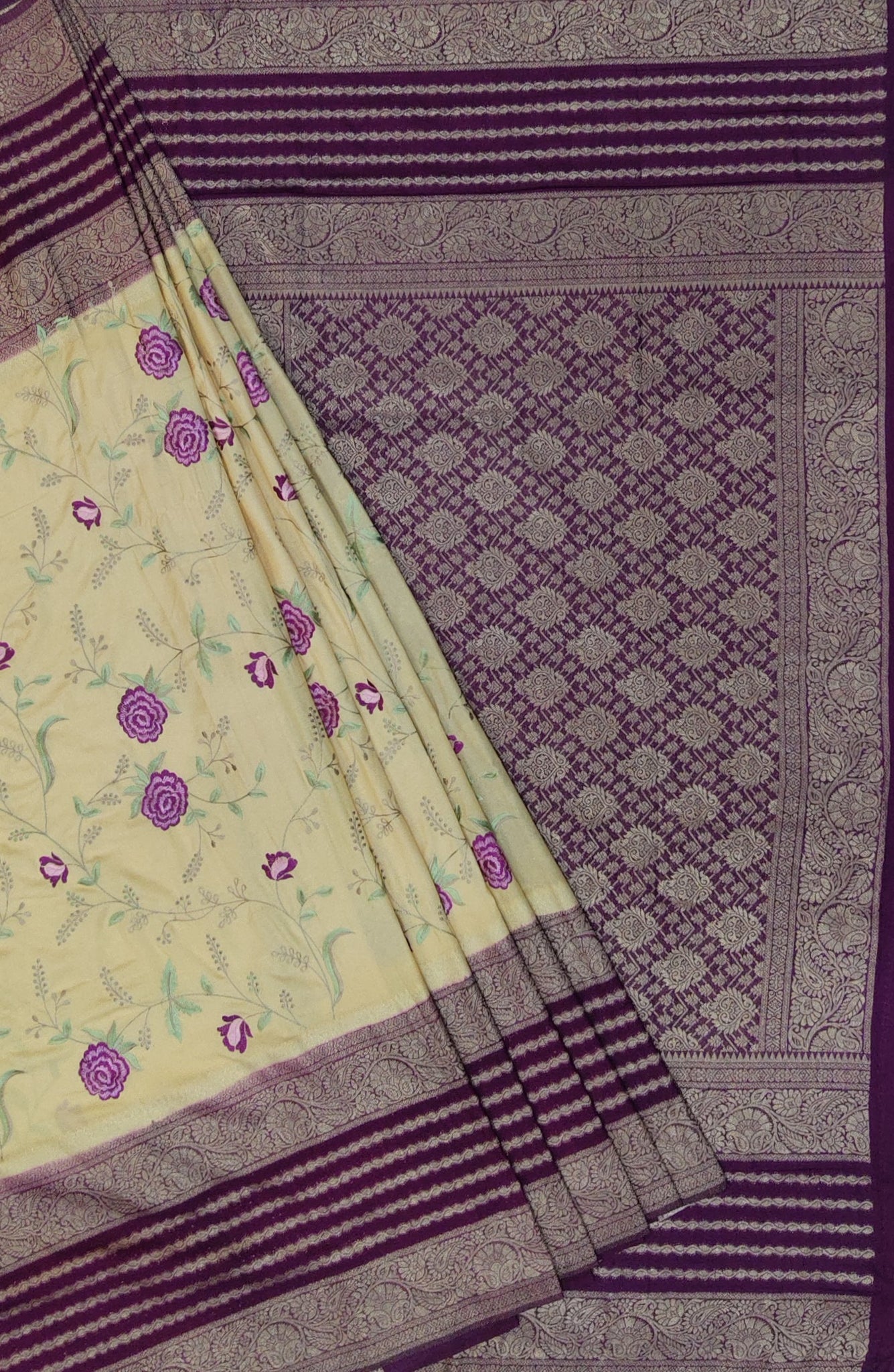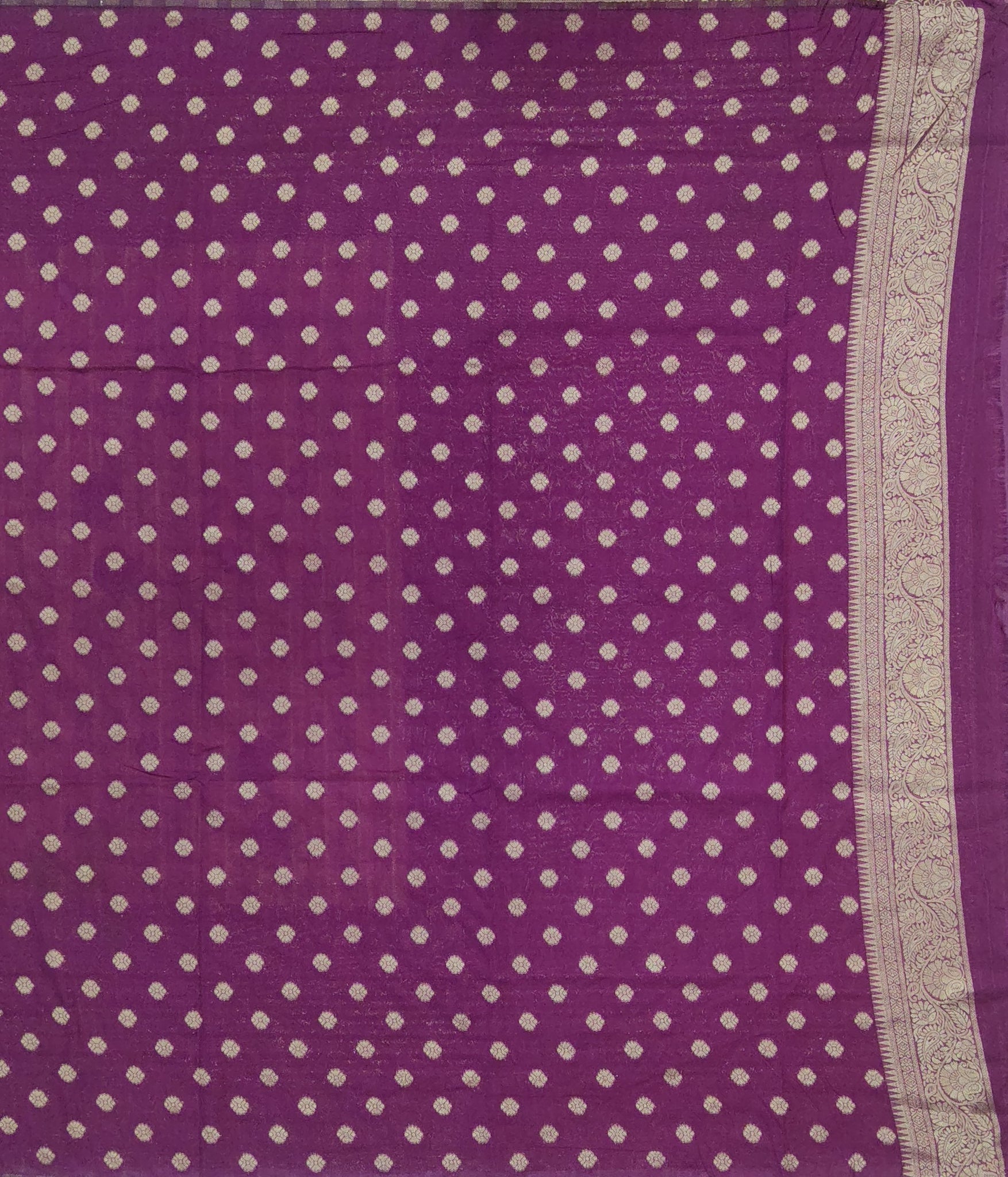 Elevate your ensemble with this Banaras Crepe Saree, exquisitely adorned with delicate Kashmiri thread work. The contrasting border and pallu add a refined touch of elegance, while the intricately designed butti blouse completes the sophisticated look. Perfect for special occasions, this saree blends traditional craftsmanship with timeless style.