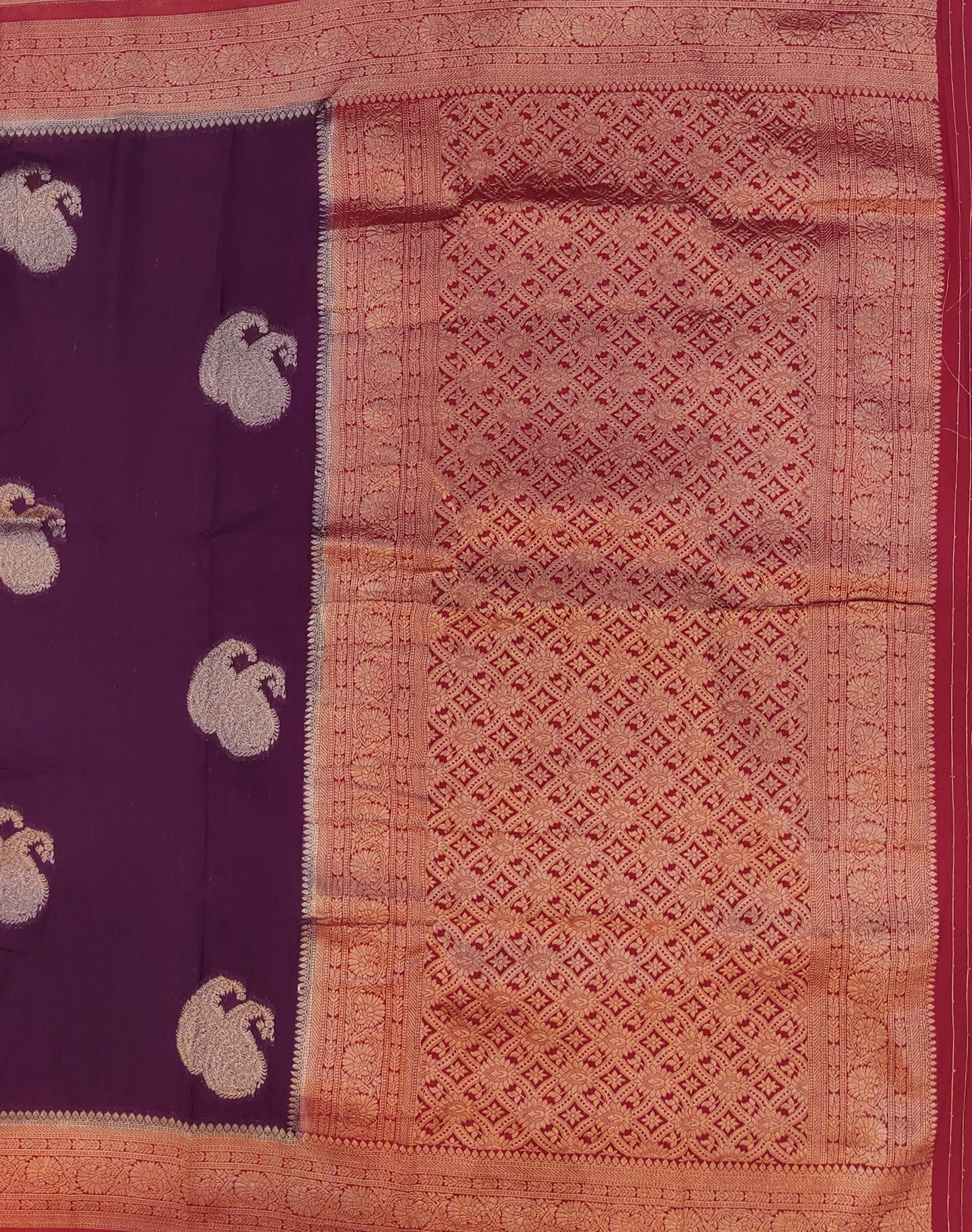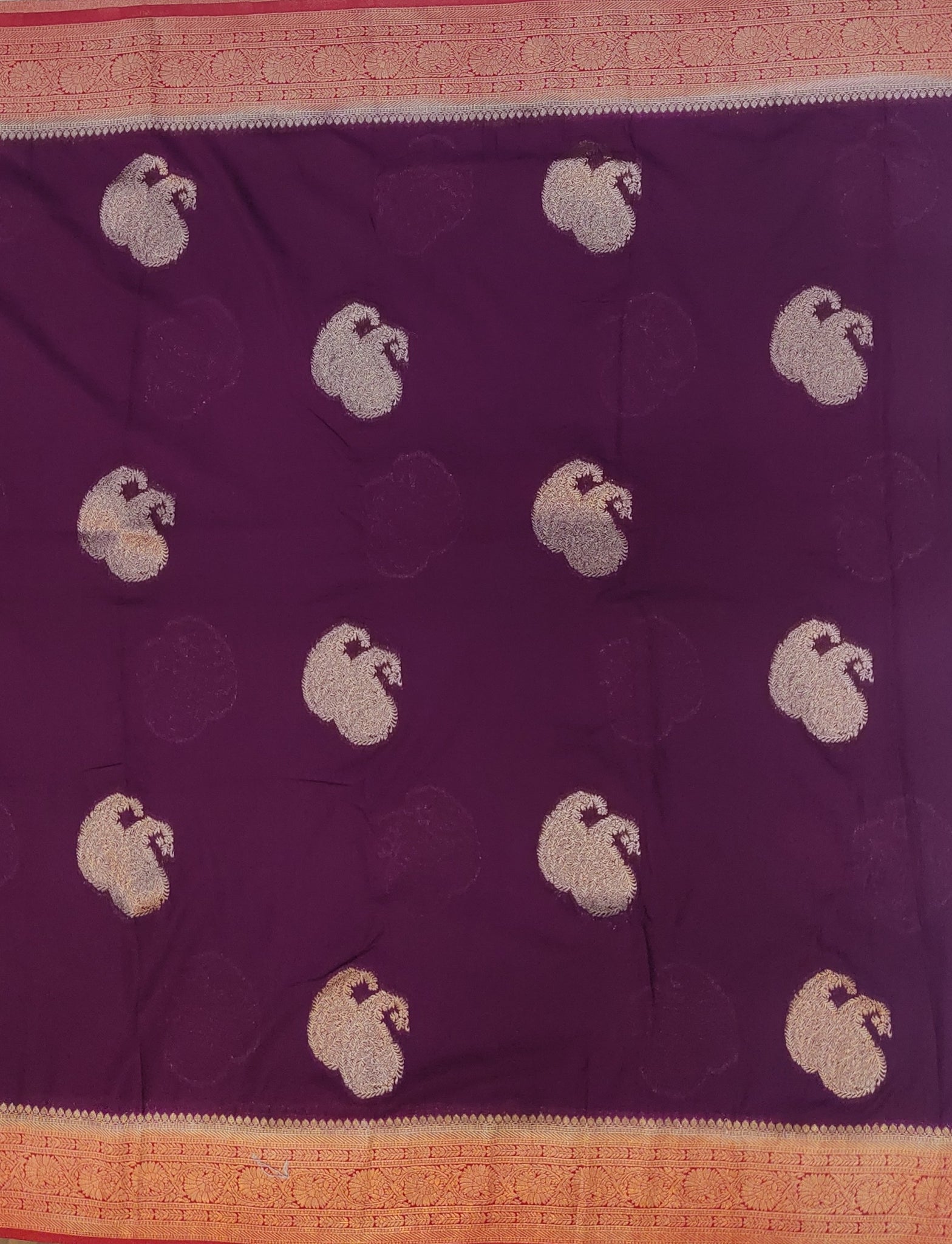Elevate your wardrobe with this Banaras Georgette Saree in elegant off-white, adorned with intricate paisley buttis throughout. The contrasting border and pallu add a refined touch, perfectly complemented by the matching blouse. Crafted for grace and style, this saree offers a sophisticated silhouette ideal for festive occasions and formal events.