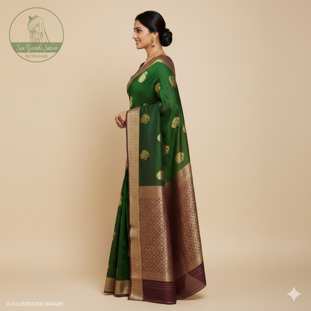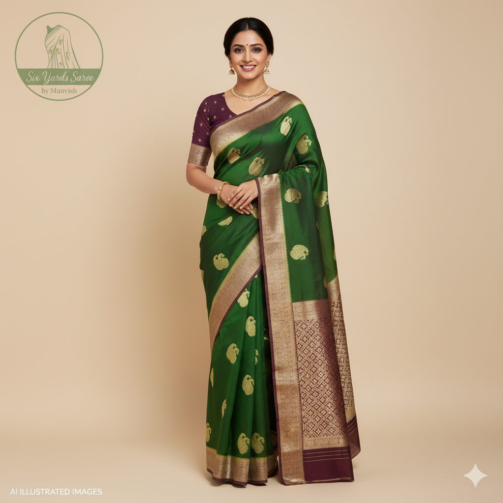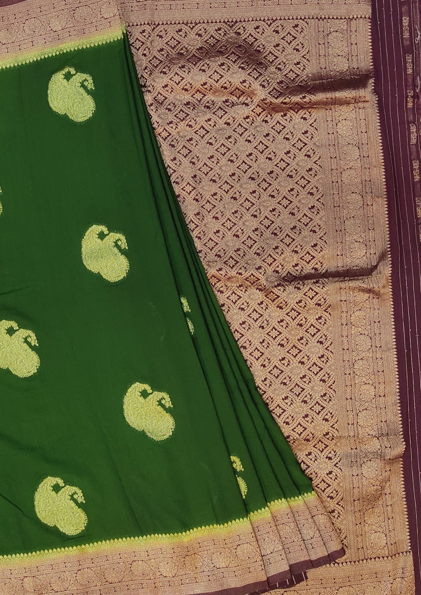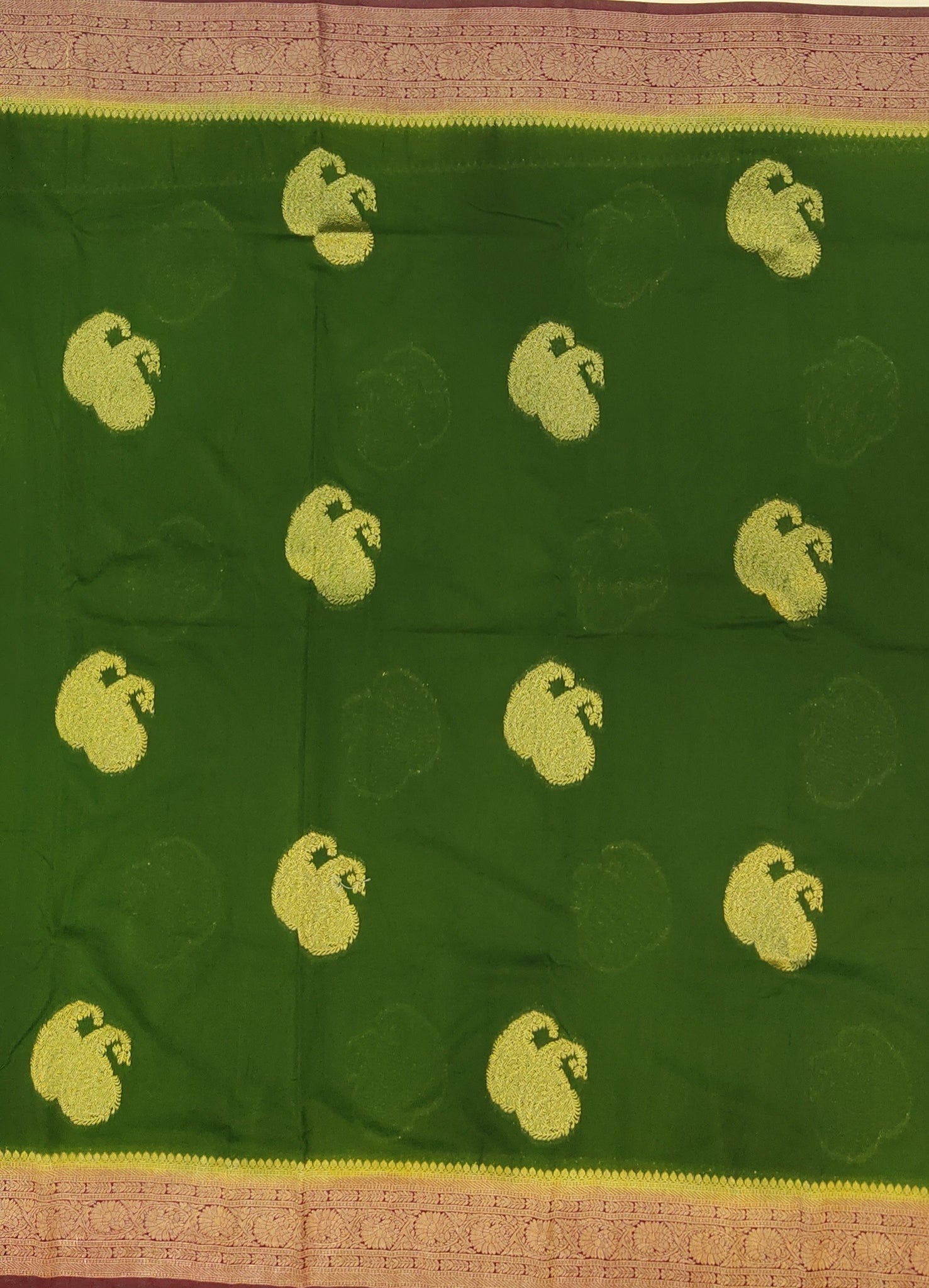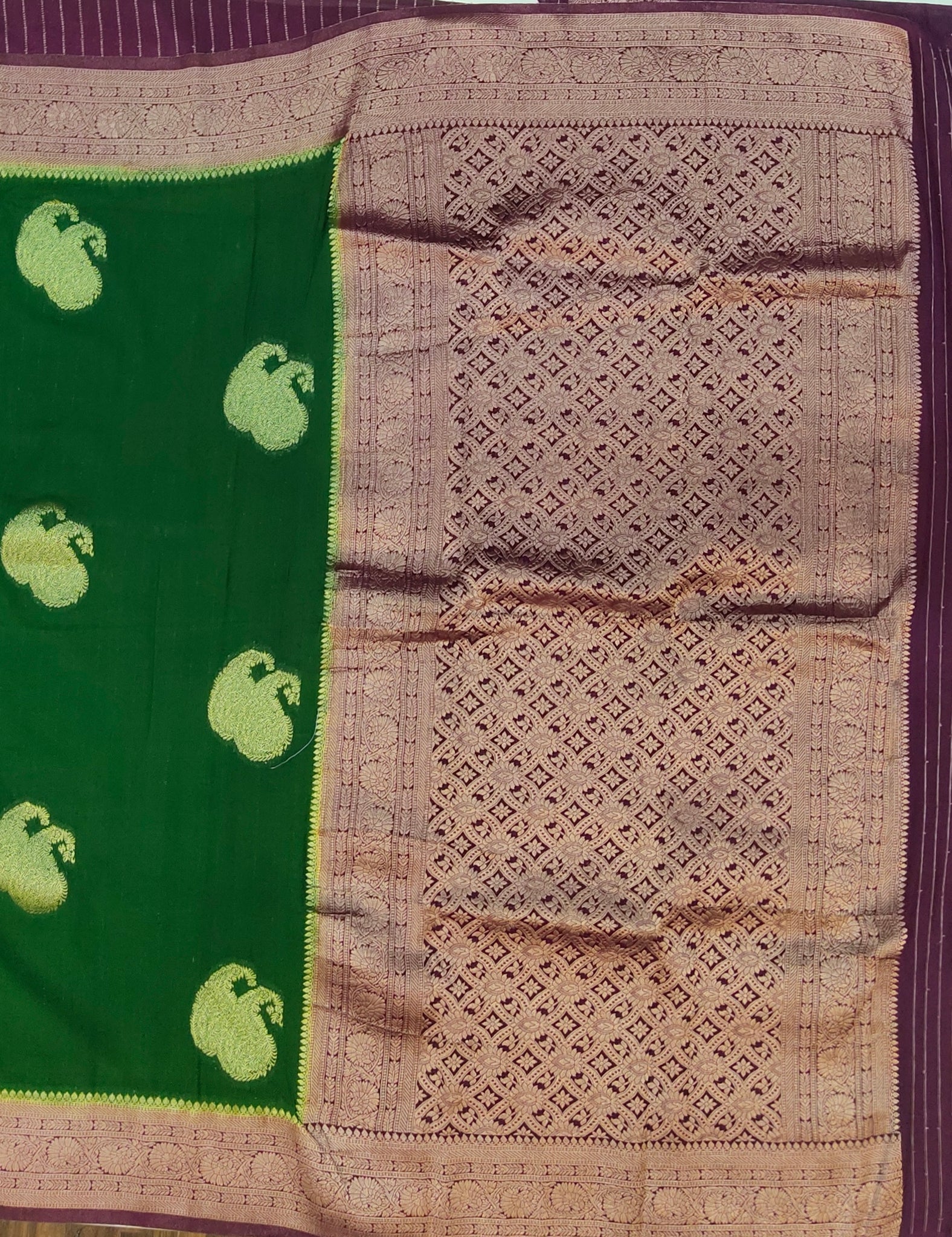 Banaras Georgette Saree with Paisley Buttis all over with Contrast Border,Paluu and Blouse- Dark Green