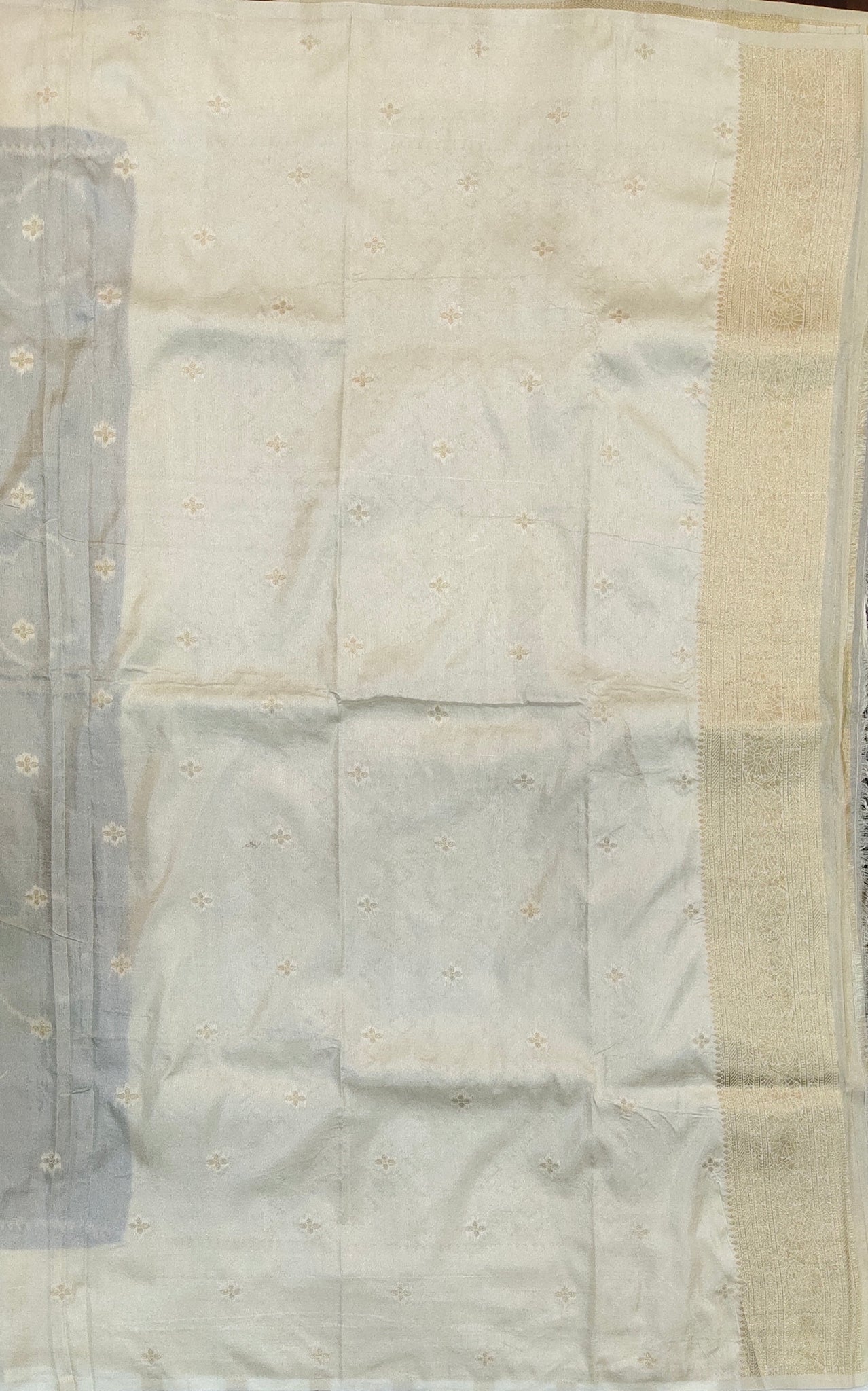 Elevate your wardrobe with this Banaras Georgette Saree in elegant off-white, adorned with intricate paisley buttis throughout. The contrasting border and pallu add a refined touch, perfectly complemented by the matching blouse. Crafted for grace and style, this saree offers a sophisticated silhouette ideal for festive occasions and formal events.