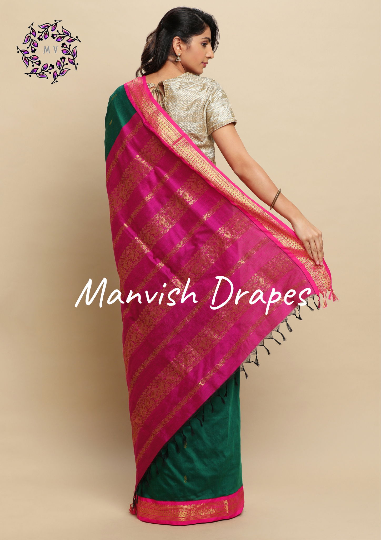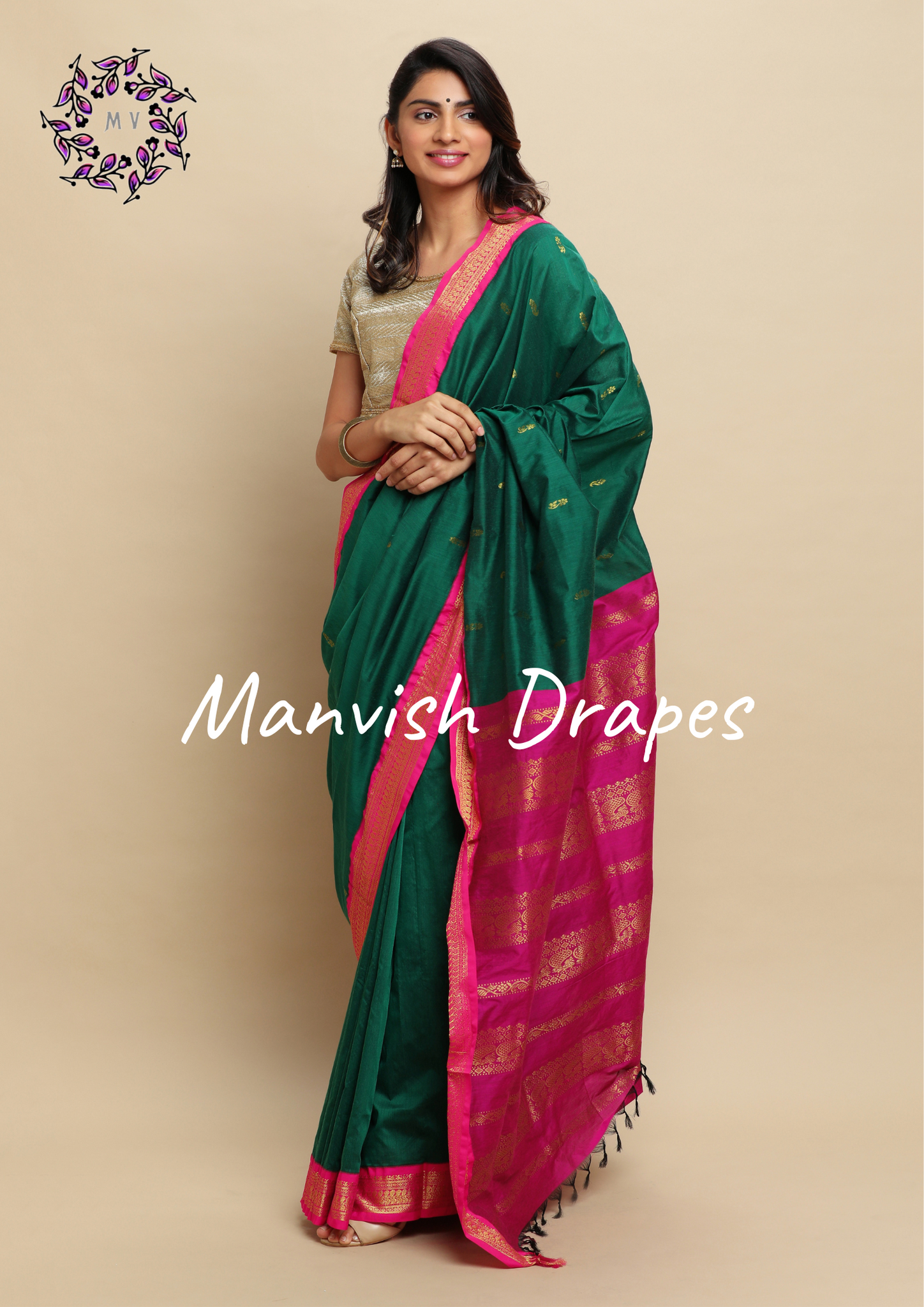 Gadwal Silk Cotton Sarees with Zari Buttas all over and Contrast Borders on both sides (LEAF GREEN RANI COMBINATION)