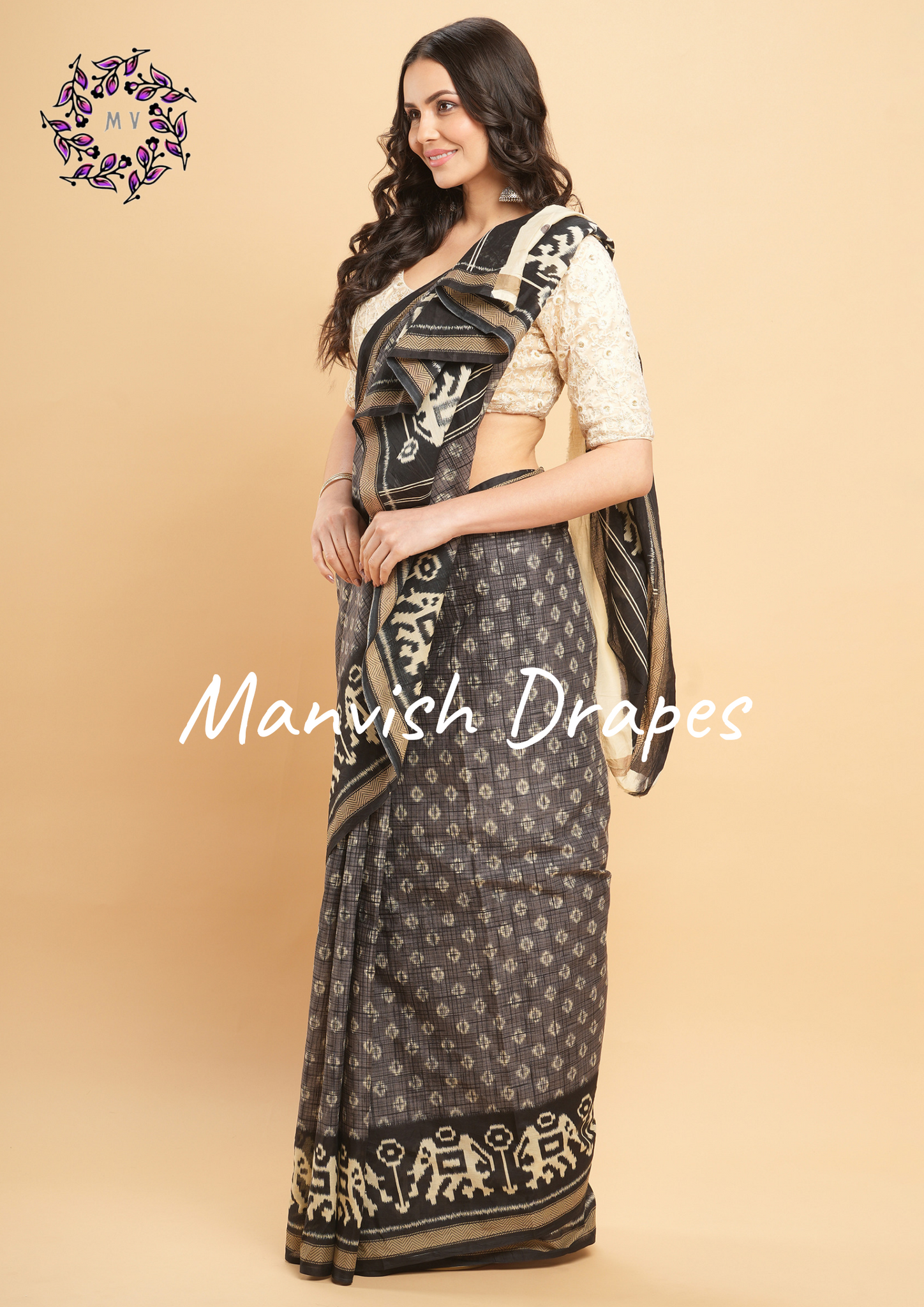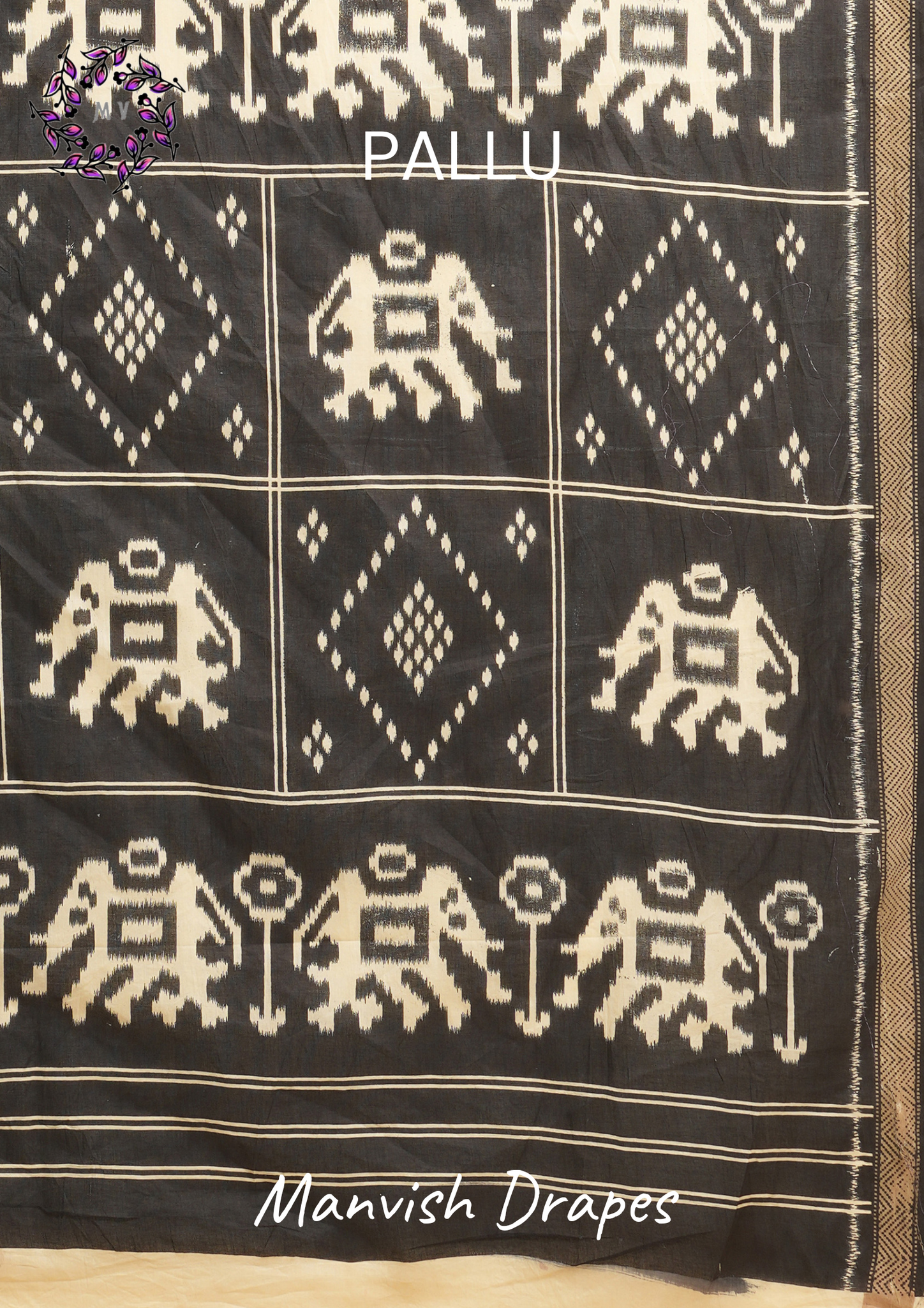 Mul Mul Pure Cotton Saree with Ikat Prints all over (GREY-BLACK COMBINATION)