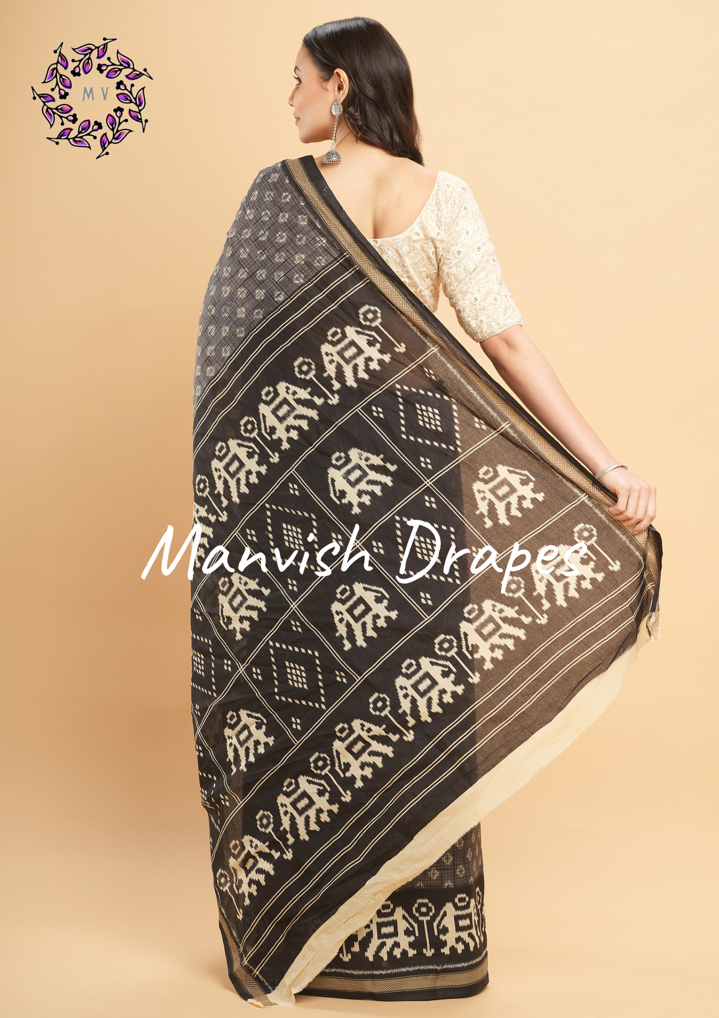 This Grey Mul Mul Pure Cotton Saree with Ikat Prints is a timeless, transitional piece for your wardrobe. The elegant Ikat print paired with a subtle grey and black combination is fully enhanced with the majestic Elephant motifs adorning the border and pallu for a luxurious finish. Lightweight and comfortable, it transitions seamlessly from the office to everyday wear. Crafted with luxurious Mul Mul cotton fabric, it adds a sophisticated touch to any ensemble. Perfect for making a statement of effortless elegance, you'll have heads turning wherever you go.