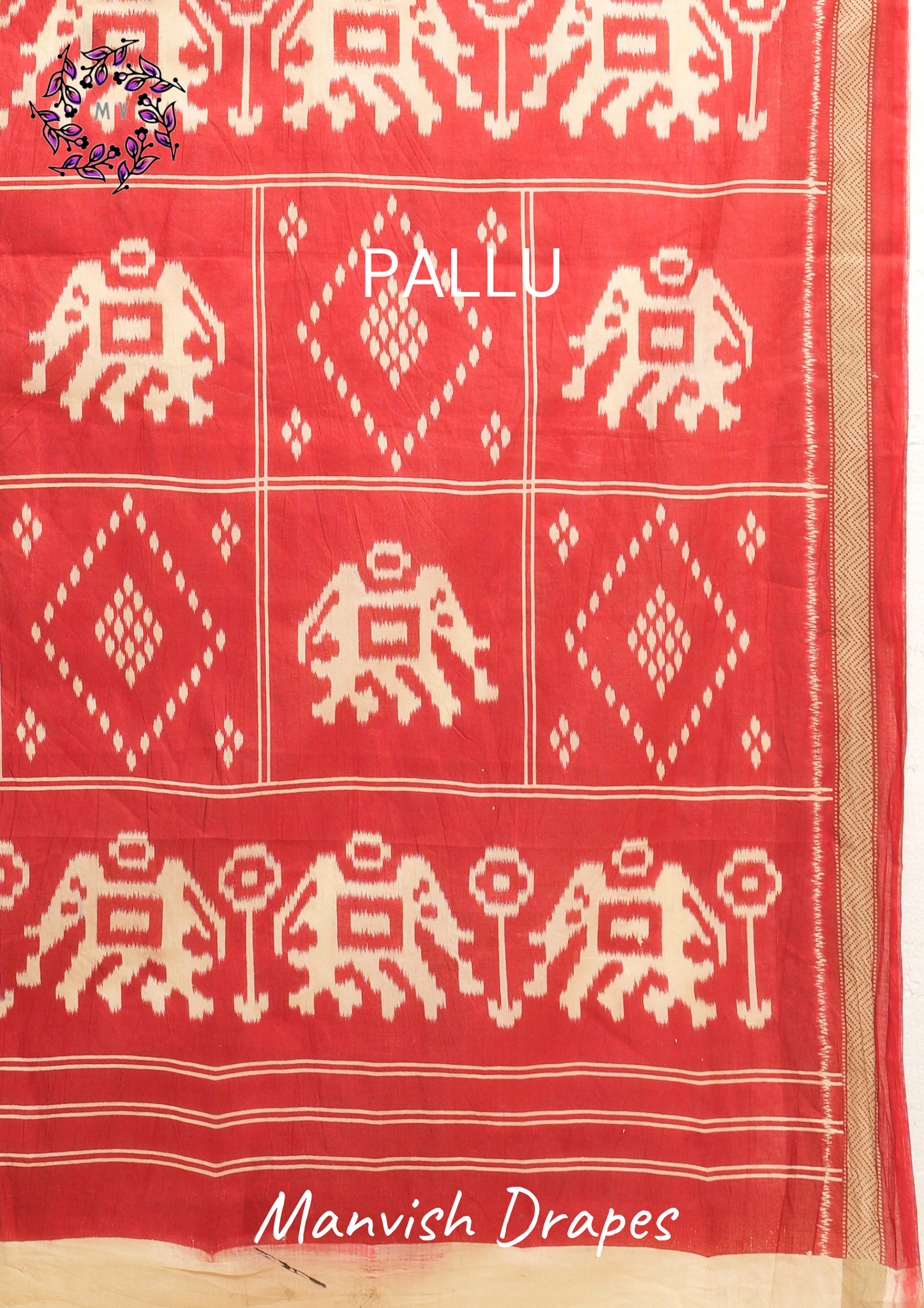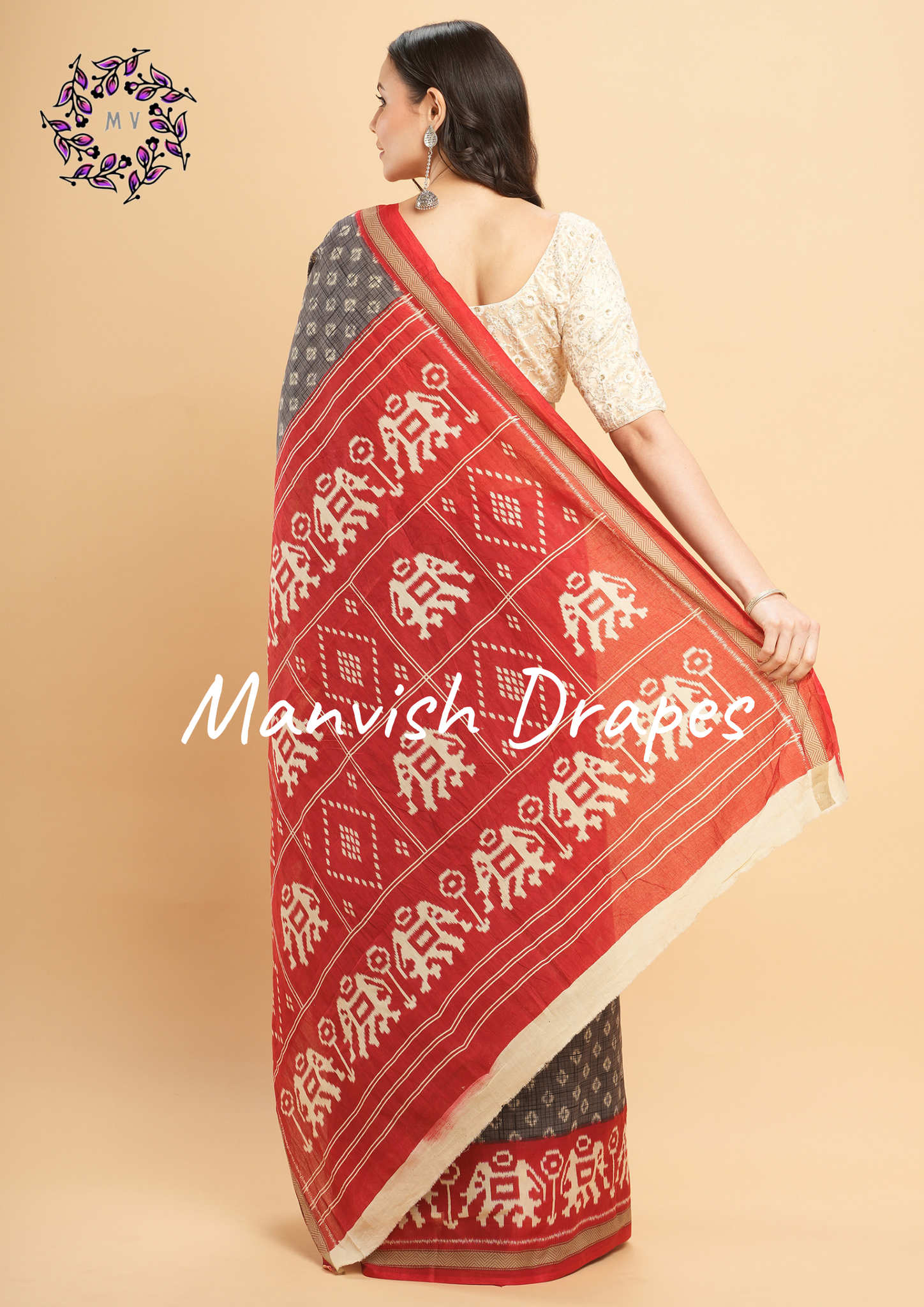 This Grey Mul Mul Pure Cotton Saree with Ikat Prints is a timeless, transitional piece for your wardrobe. The elegant Ikat print paired with a subtle Grey and Red combination is fully enhanced with the majestic Elephant motifs adorning the border and pallu for a luxurious finish. Lightweight and comfortable, it transitions seamlessly from the office to everyday wear. Crafted with luxurious Mul Mul cotton fabric, it adds a sophisticated touch to any ensemble. Perfect for making a statement of effortless elegance, you'll have heads turning wherever you go.