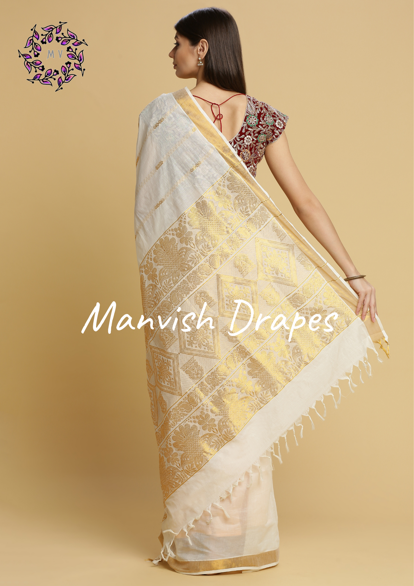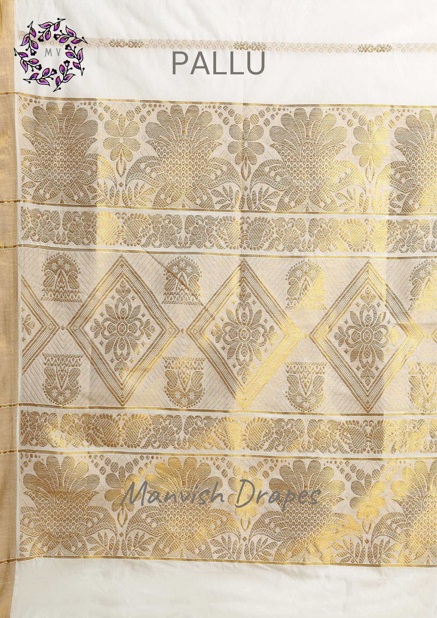 This classic Kerala Kasavu Saree is a timeless statement piece, expertly crafted from pure cotton with its subtle Buttas, Tissue Border, and Woven Pallu providing a luxurious, sophisticated touch. Make it your go-to choice for all your special occasions and exude elegance and grace.