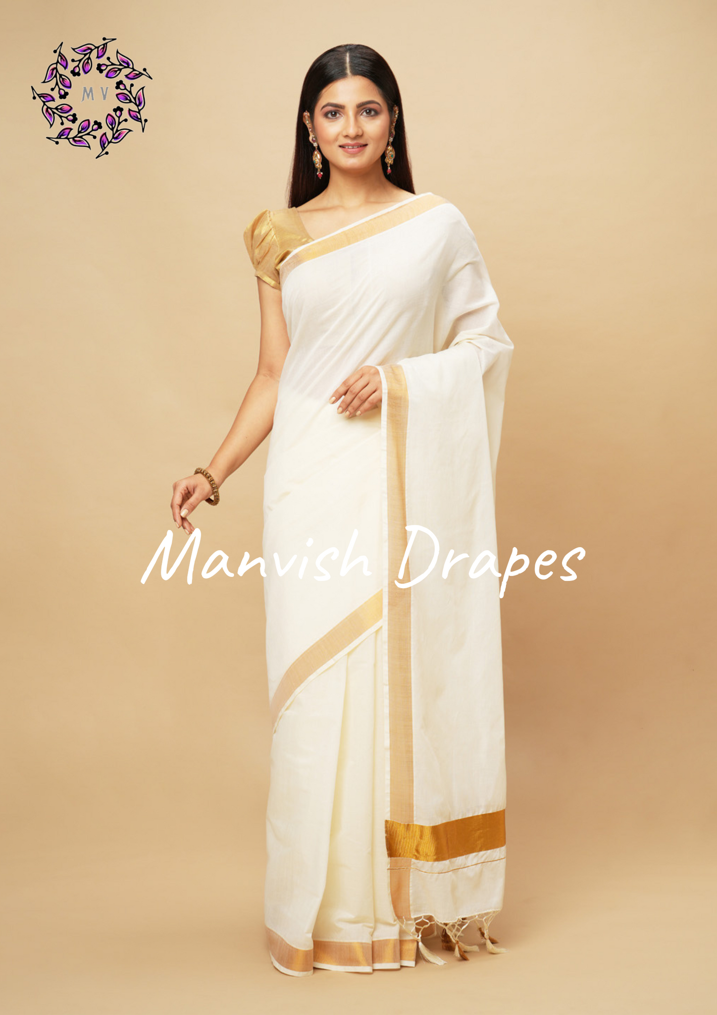Elevate your style with our Plain Kerala Kasavu Pure Cotton Saree. This elegant saree boasts a touch of luxury with its intricate gold zari details and tassels. Crafted from soft and lightweight cotton, it's not only a stunning addition to your ethnic wardrobe, but also comfortable and beneficial for your skin. A must-have for any sophisticated woman.