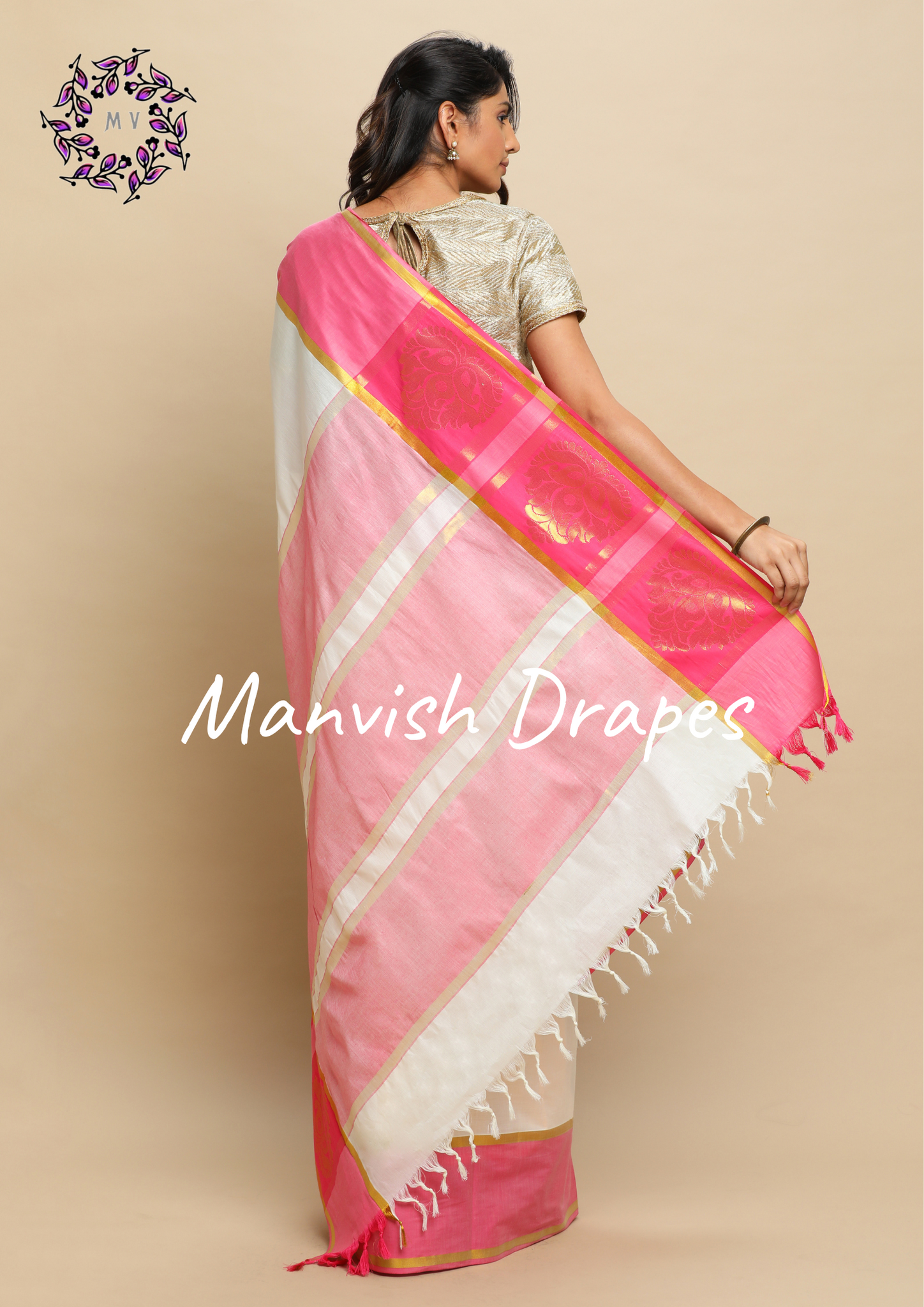 Plain Kerala Kasavu Pure Cotton Saree with Woven Border (PINK BORDER)
