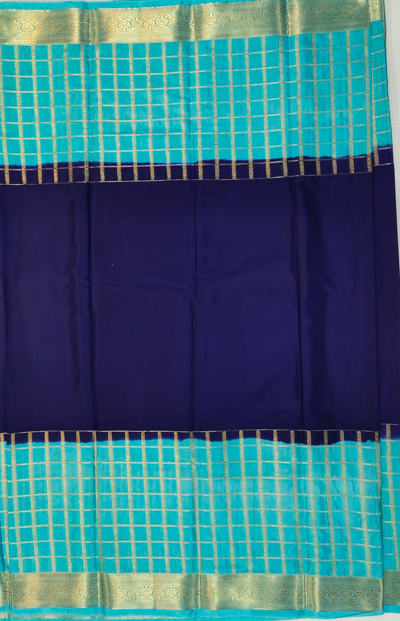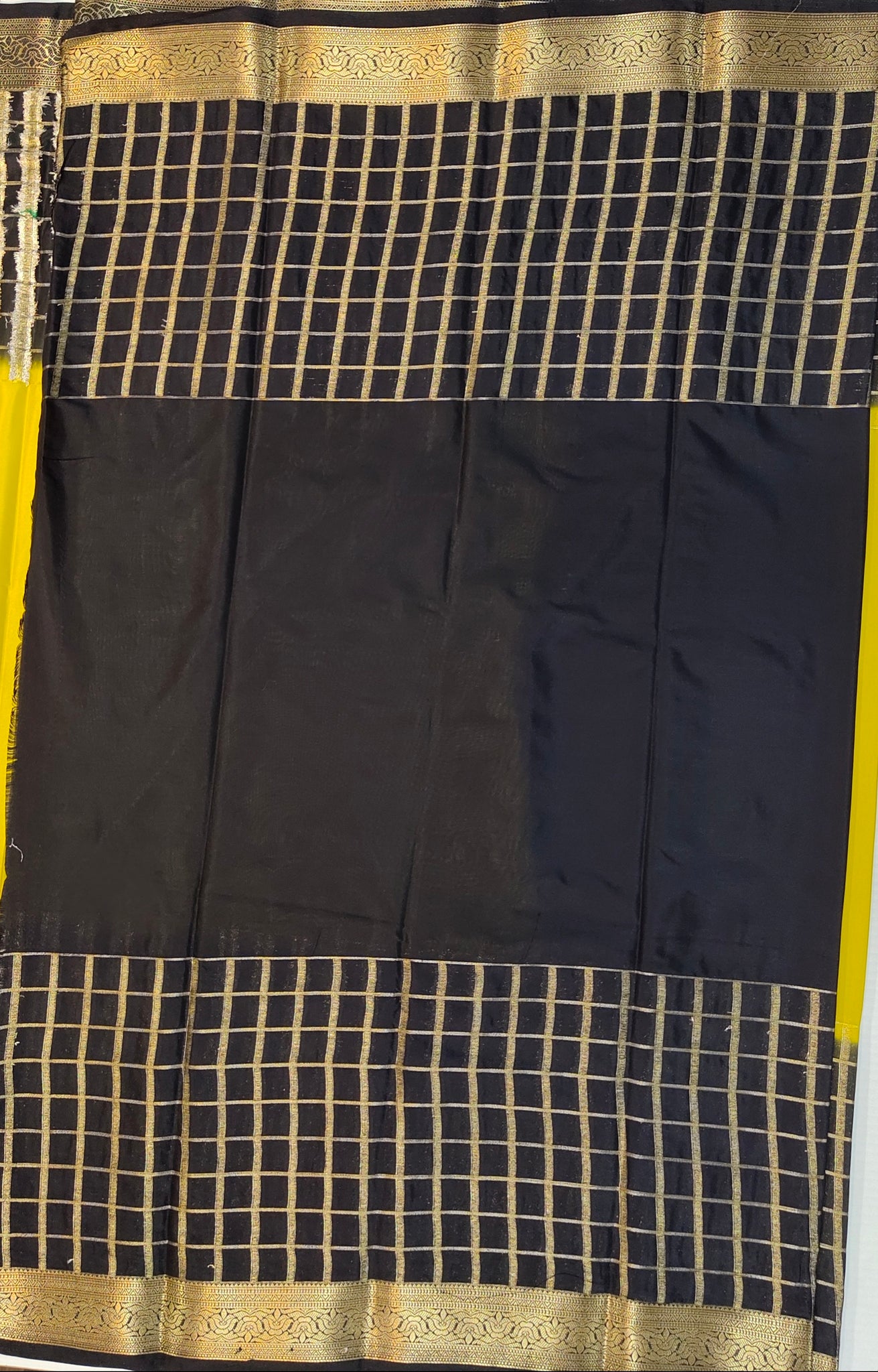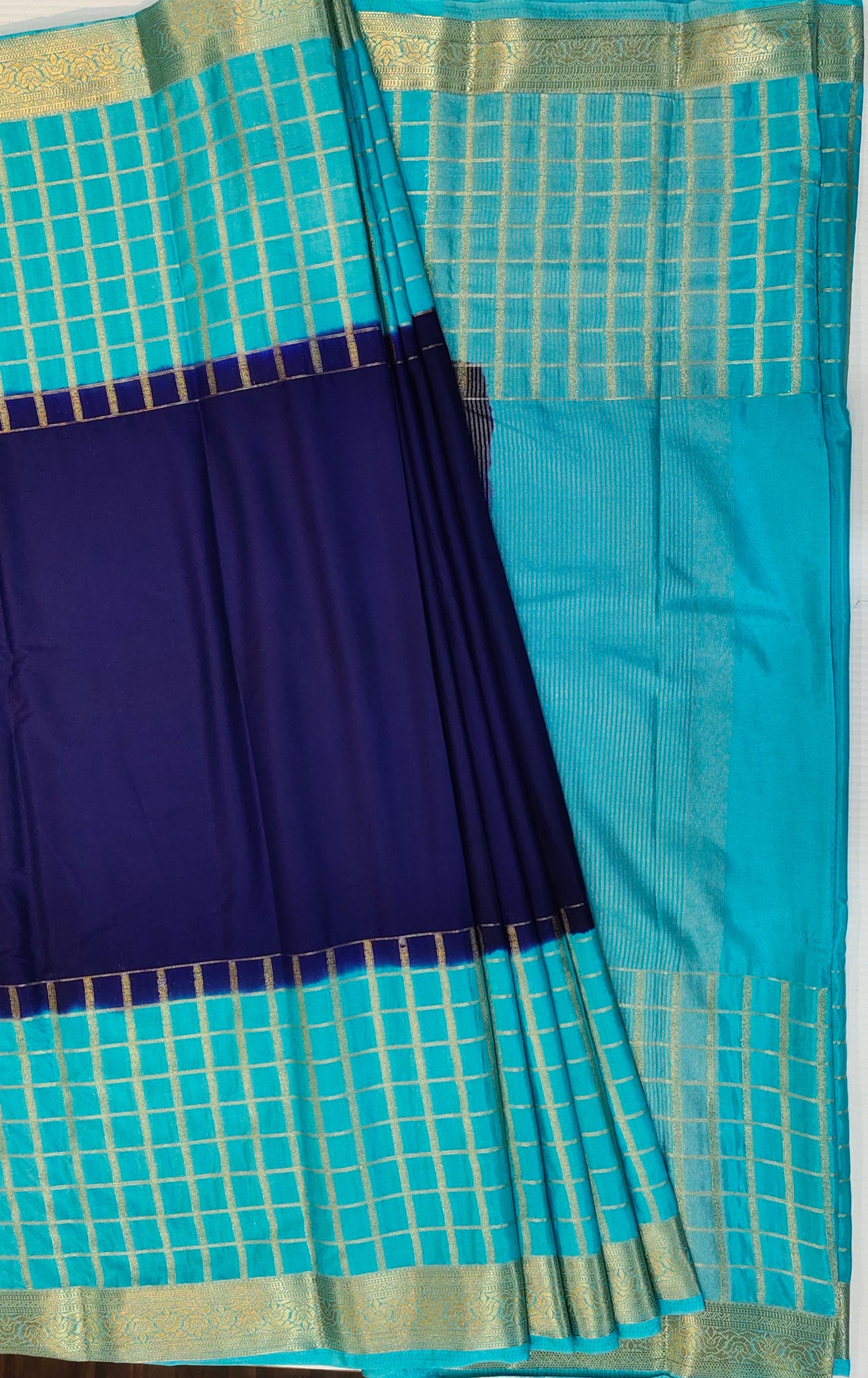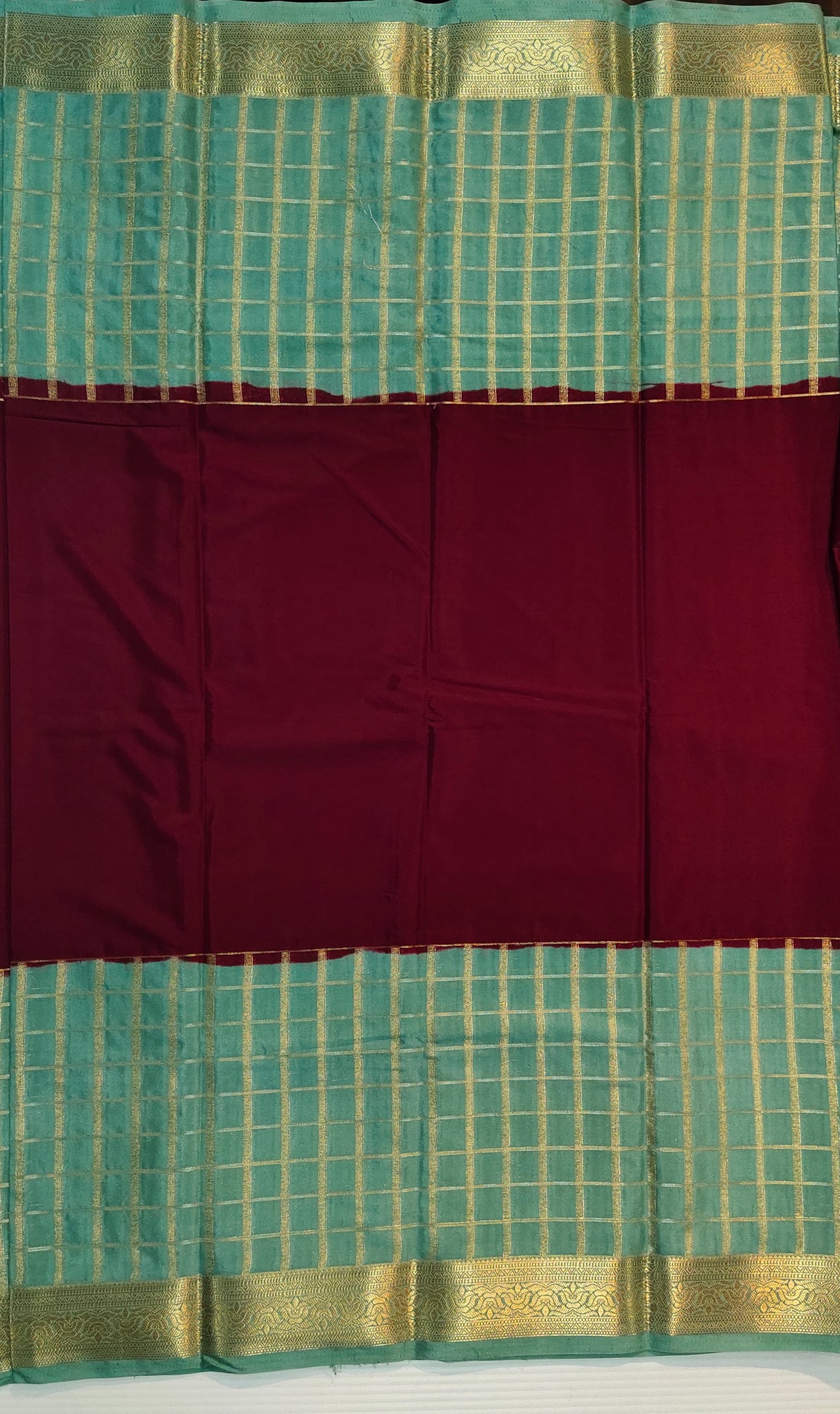 Elevate your wardrobe with this Semi Mysuru Crepe Saree featuring a refined checkered contrast border, pallu, and blouse. Available in multiple color options, it blends timeless elegance with modern style. The crepe fabric offers a graceful drape and comfortable wear, making it perfect for both formal occasions and festive gatherings. This saree promises a polished, sophisticated look effortlessly.