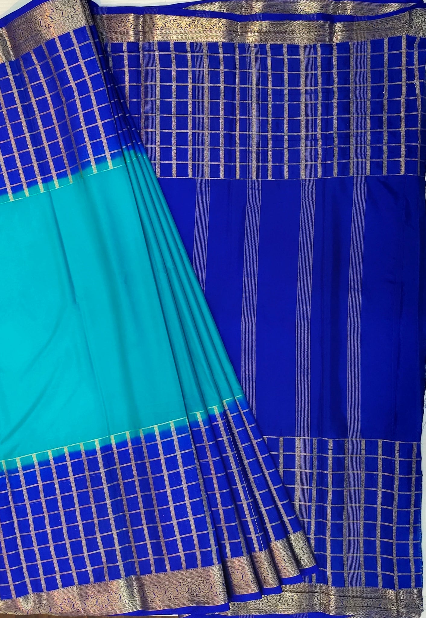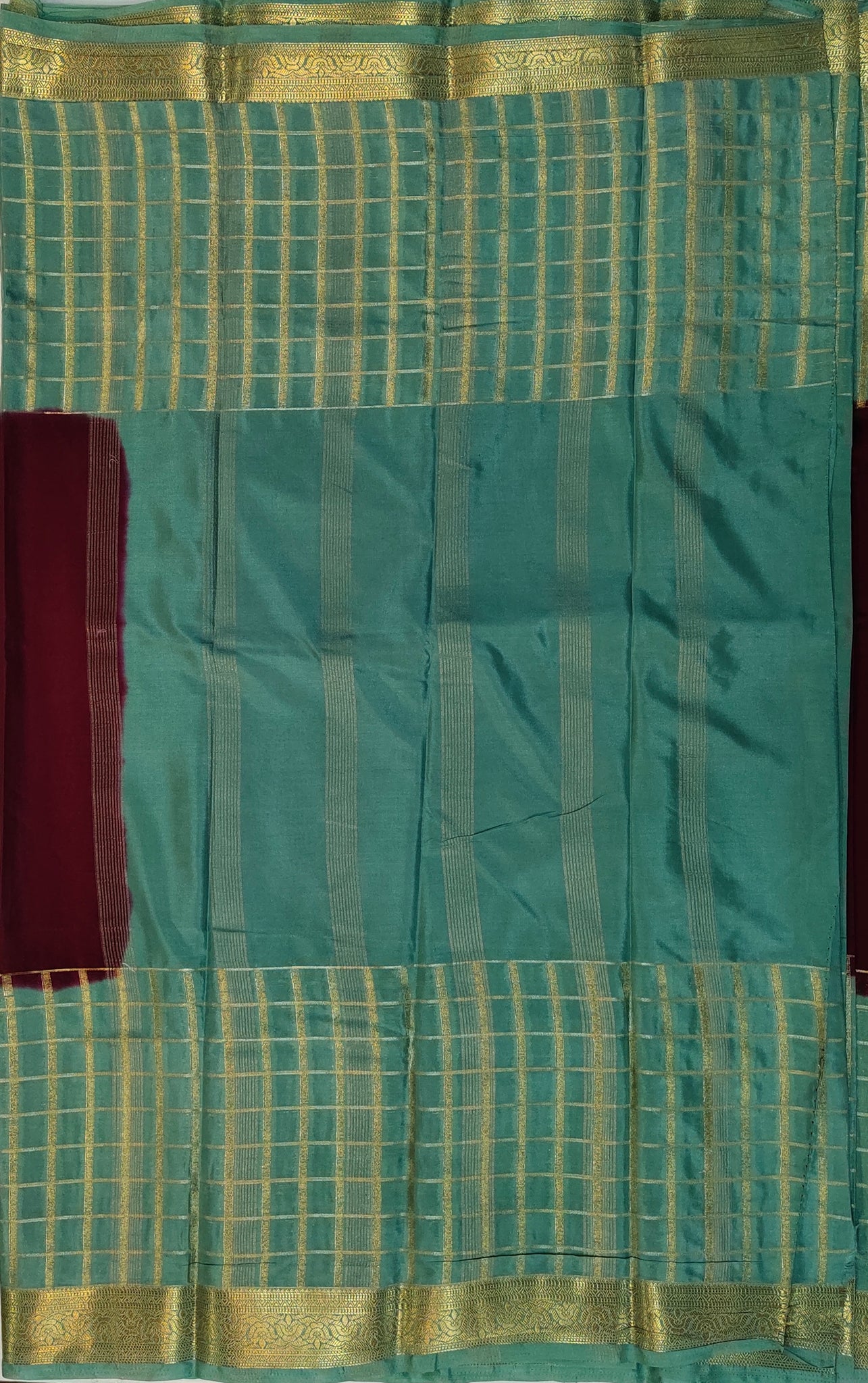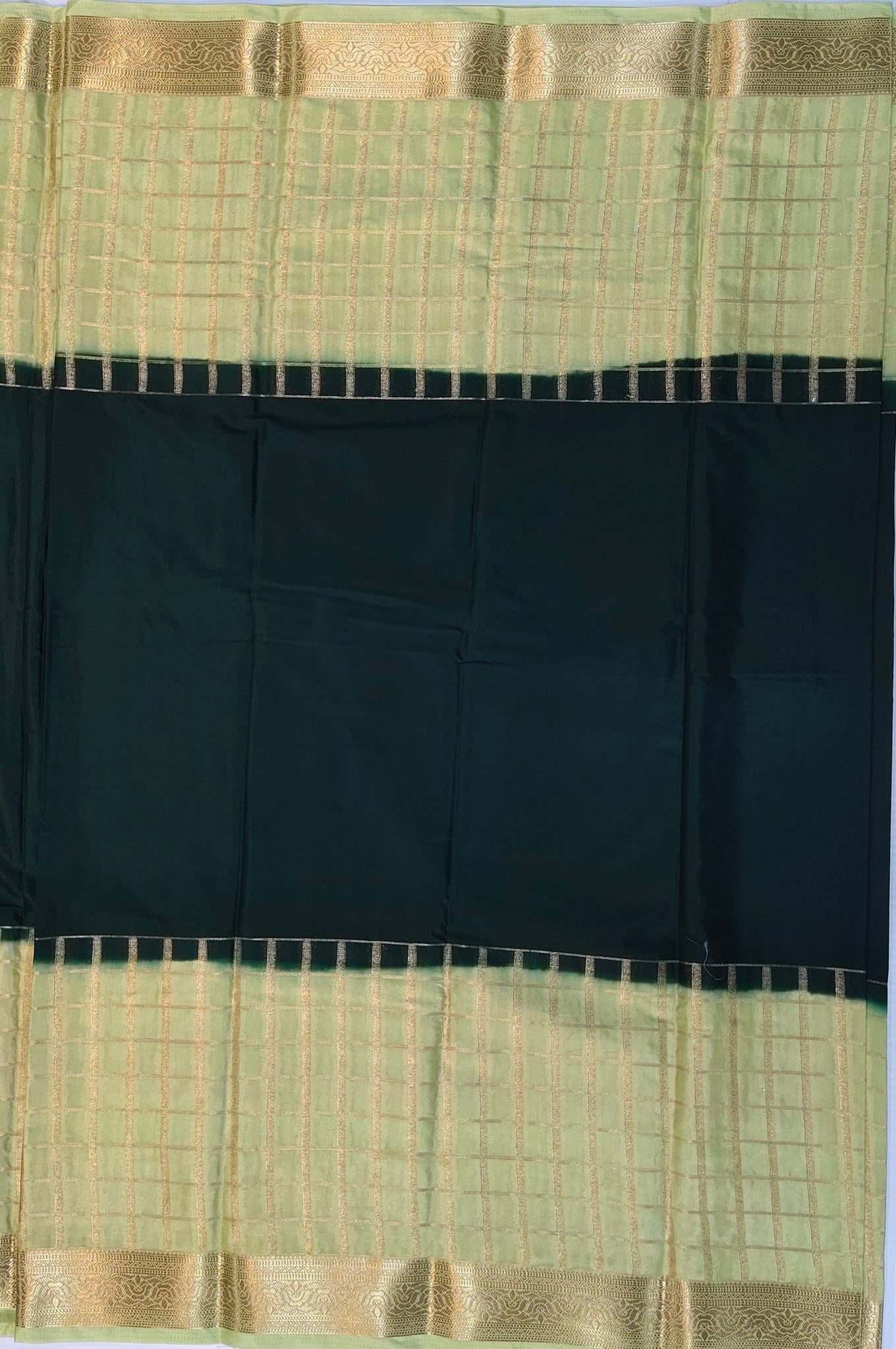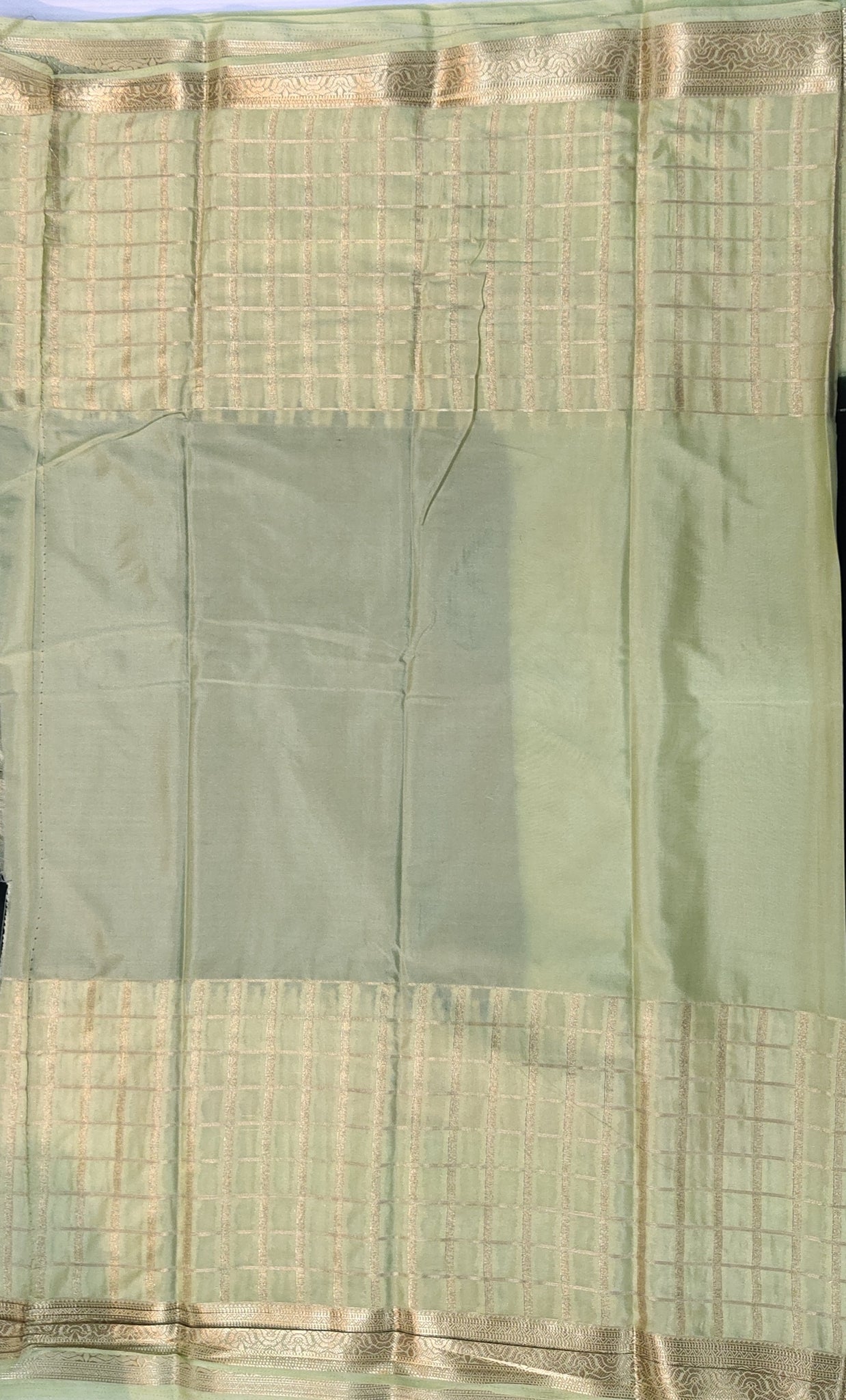 Elevate your wardrobe with this Semi Mysuru Crepe Saree featuring a refined checkered contrast border, pallu, and blouse. Available in multiple color options, it blends timeless elegance with modern style. The crepe fabric offers a graceful drape and comfortable wear, making it perfect for both formal occasions and festive gatherings. This saree promises a polished, sophisticated look effortlessly.