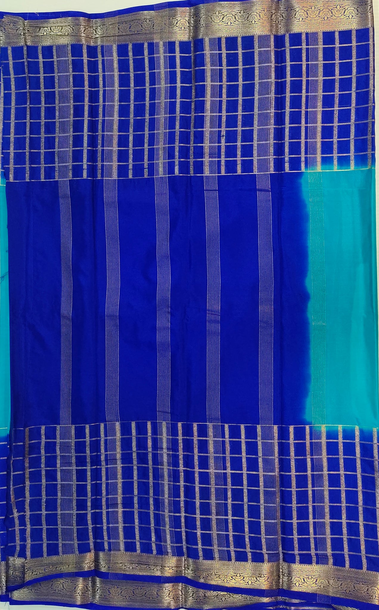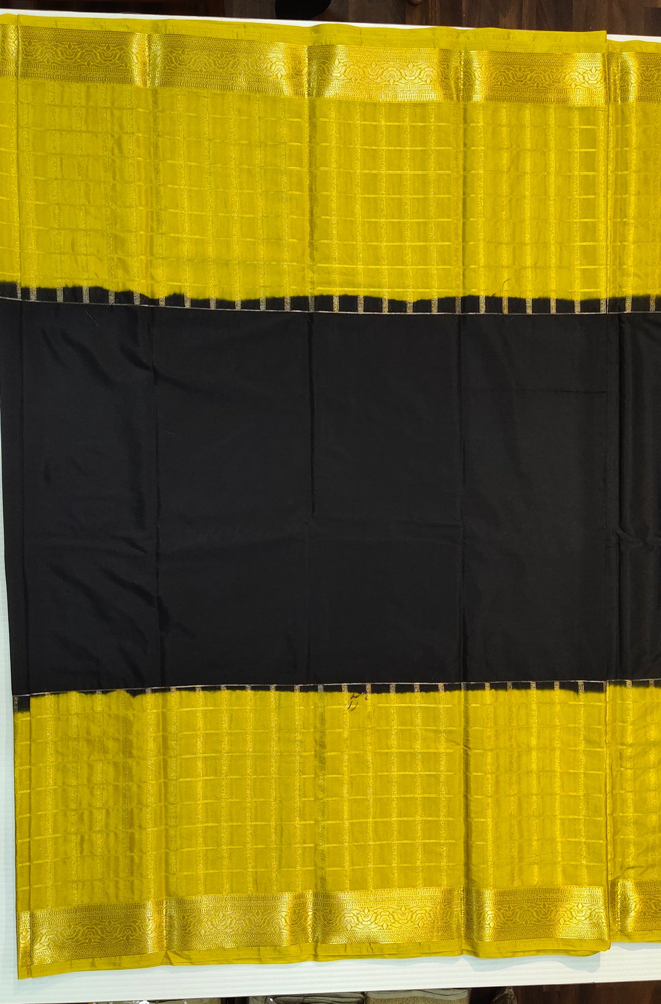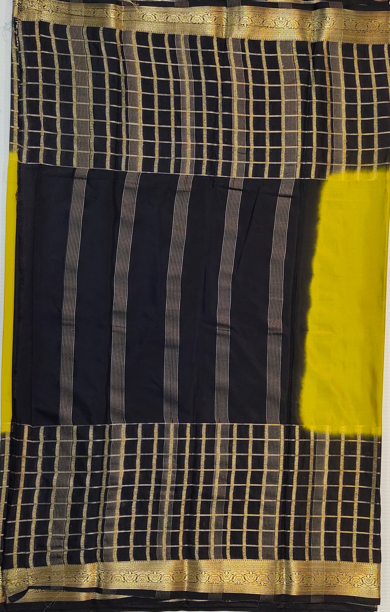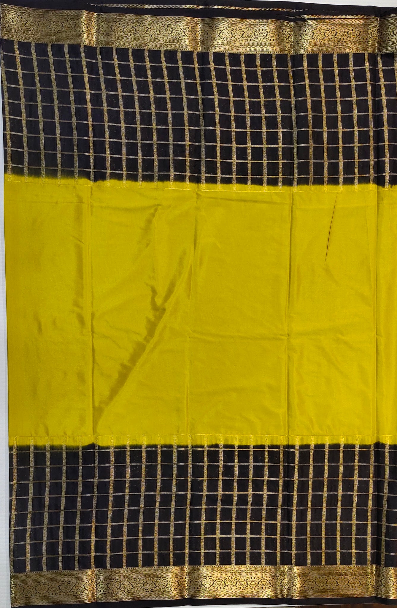 Elevate your wardrobe with this Semi Mysuru Crepe Saree featuring a refined checkered contrast border, pallu, and blouse. Available in multiple color options, it blends timeless elegance with modern style. The crepe fabric offers a graceful drape and comfortable wear, making it perfect for both formal occasions and festive gatherings. This saree promises a polished, sophisticated look effortlessly.