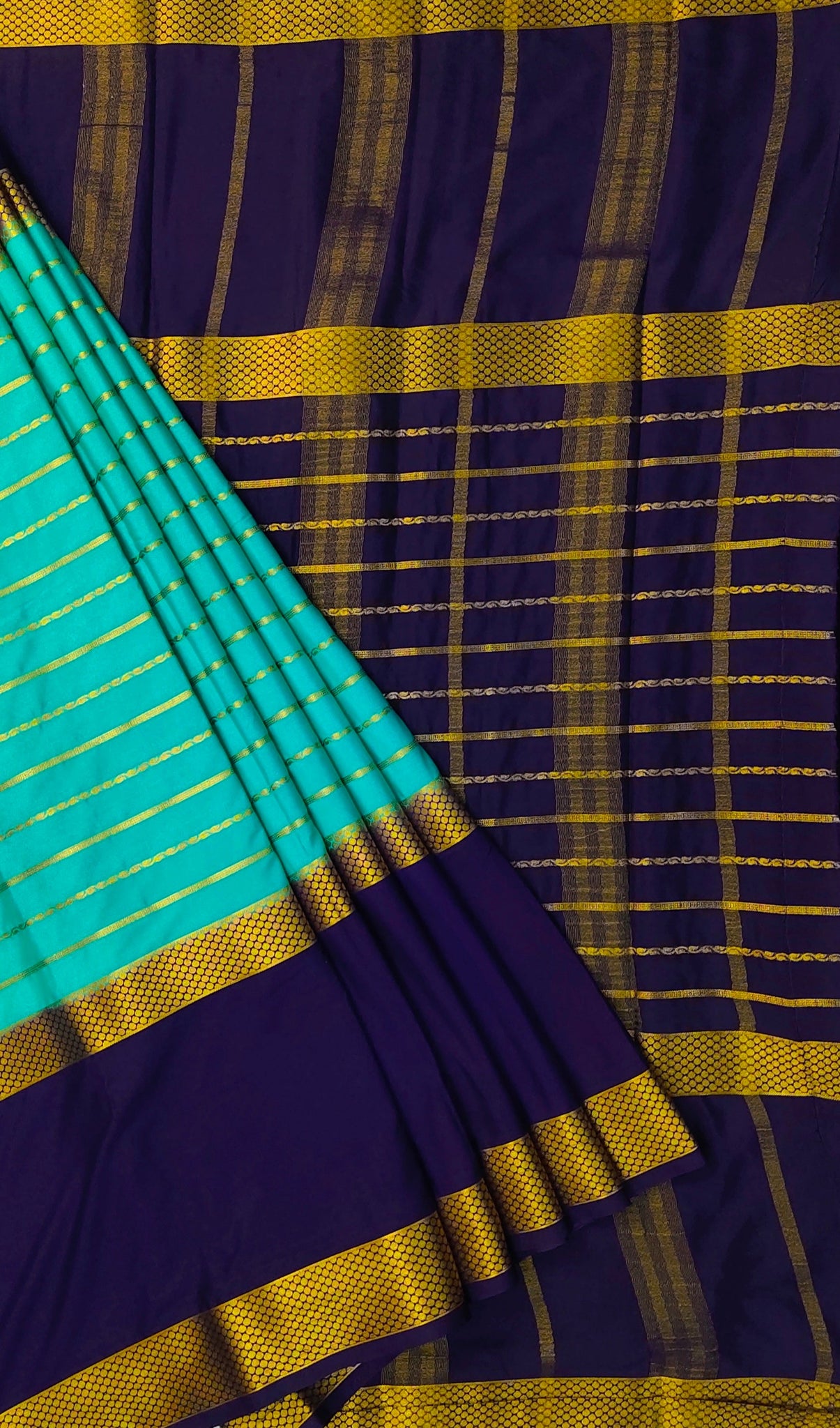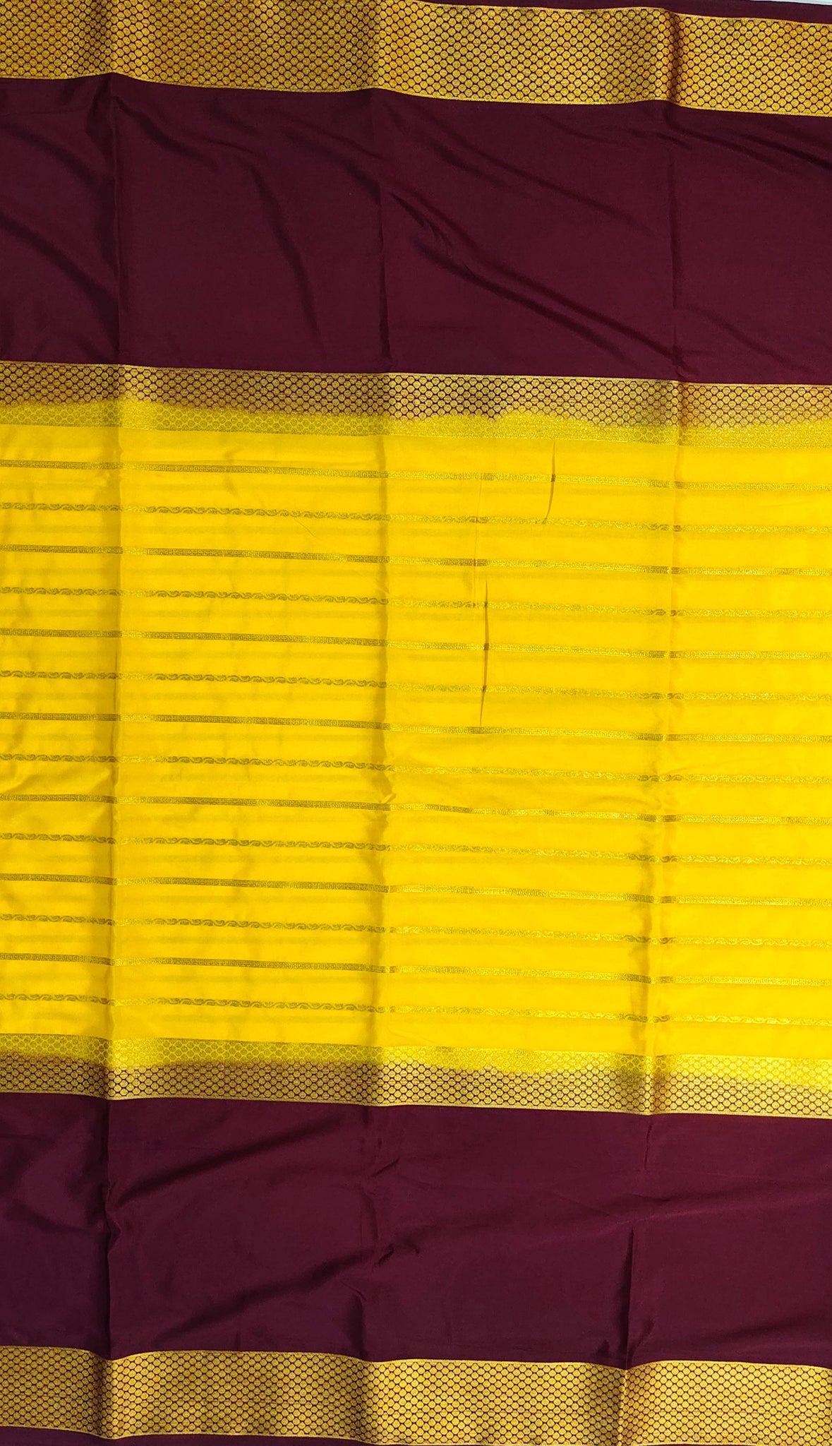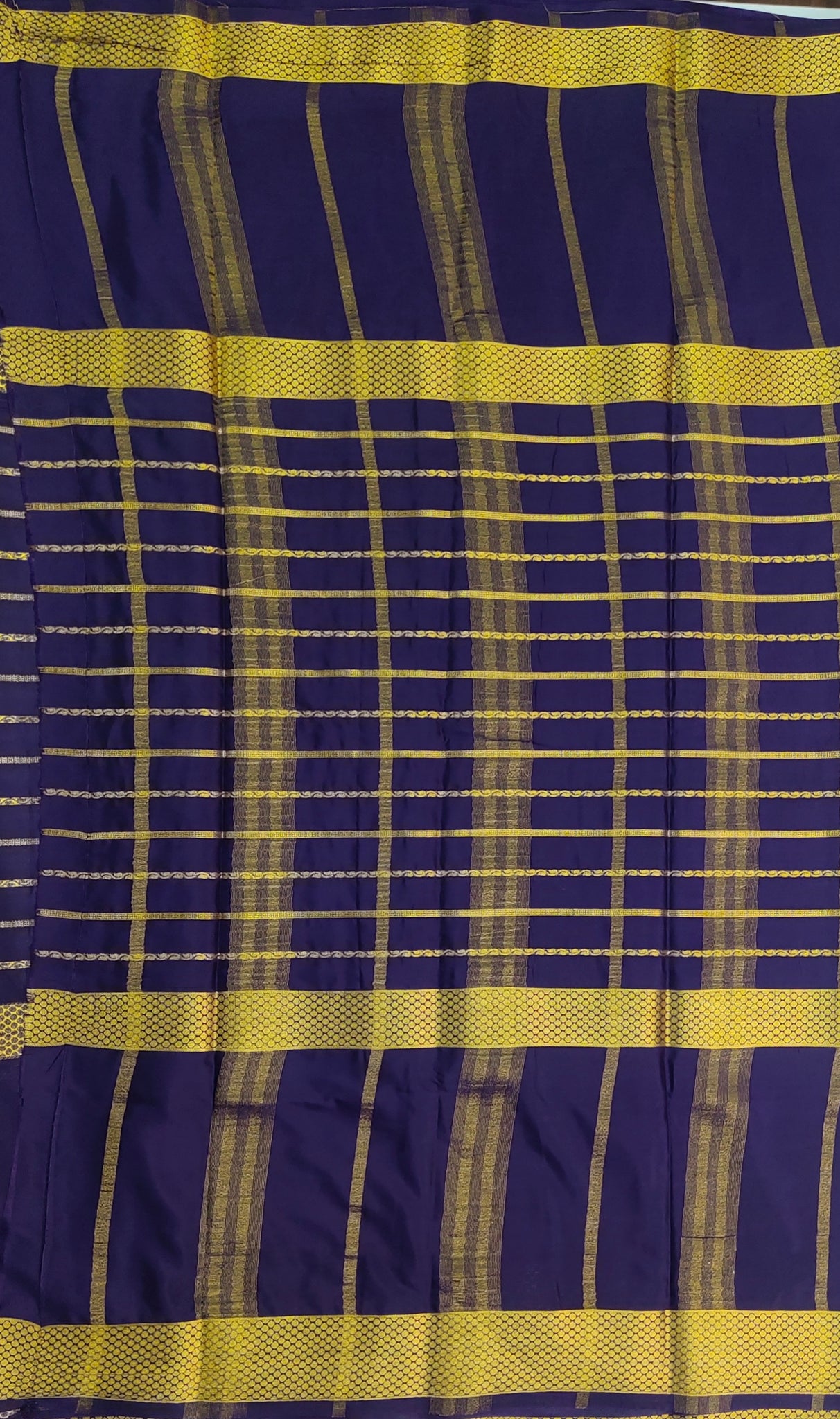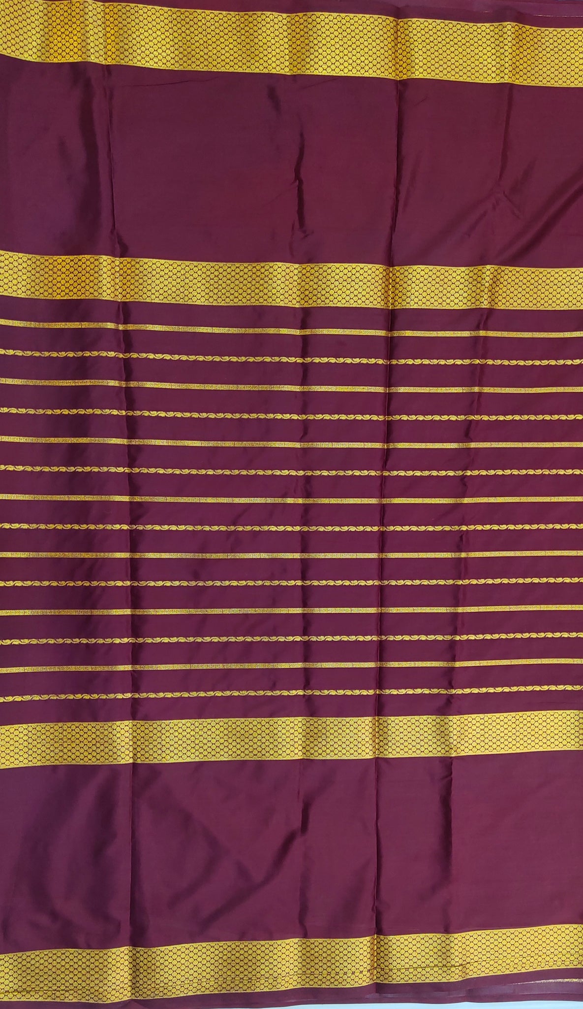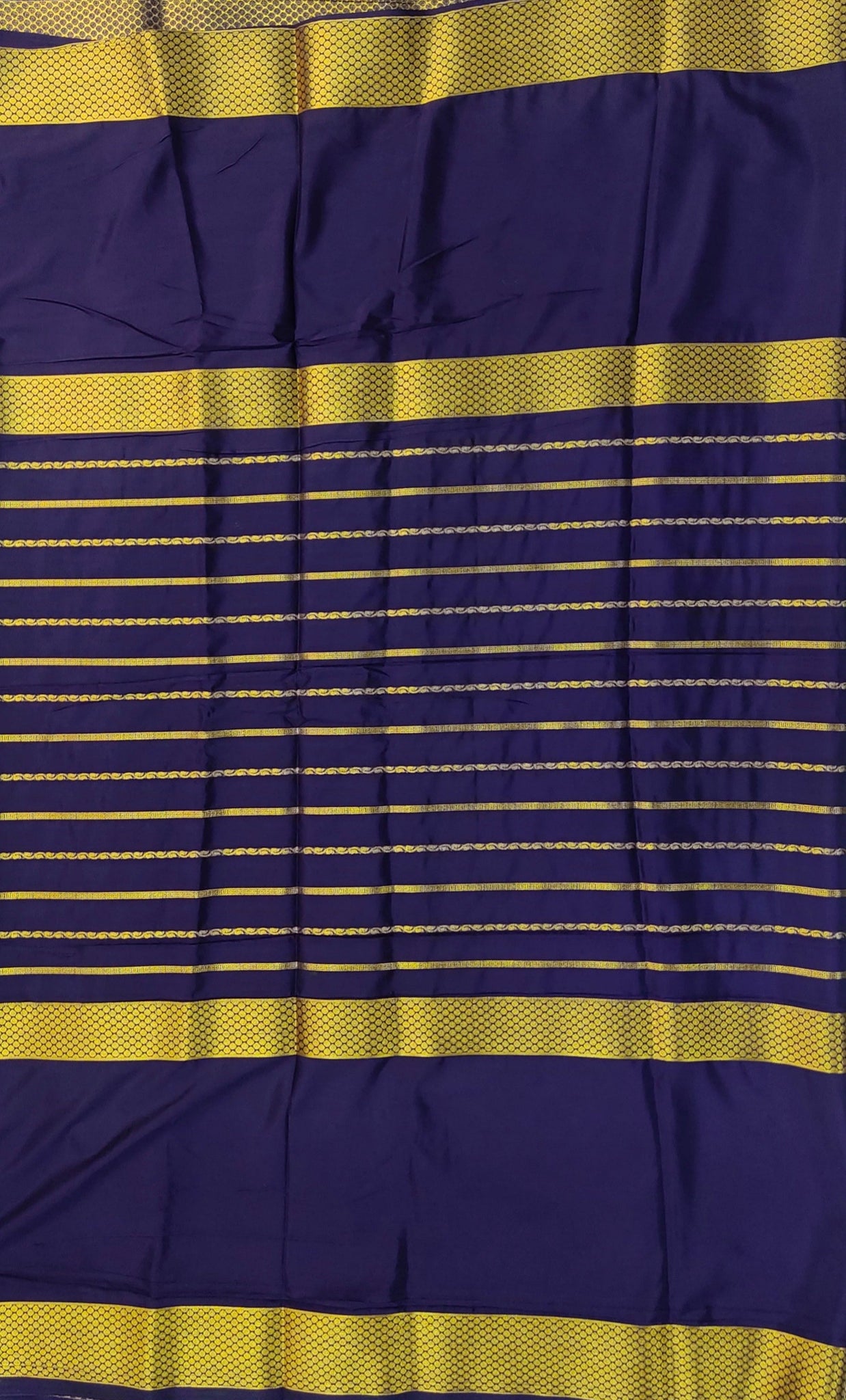 Indulge in the timeless elegance of our semi mysuru crepe Saree. Adorned with a contrasting border and blouse, this saree features a stunning striped body that exudes sophistication. Its luxurious fabric and intricate design will make you the center of attention at any event. Elevate your style with this exclusive piece.