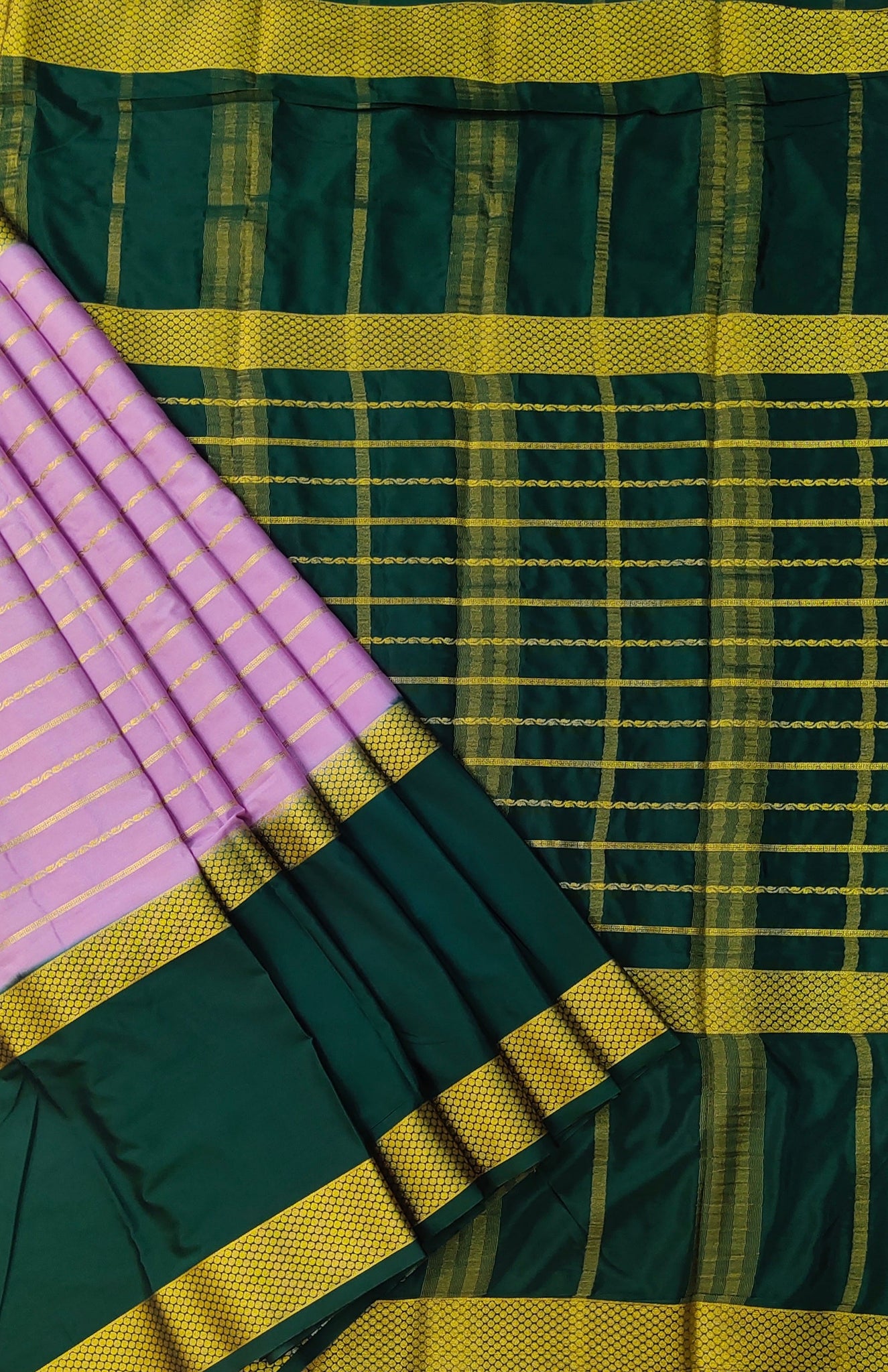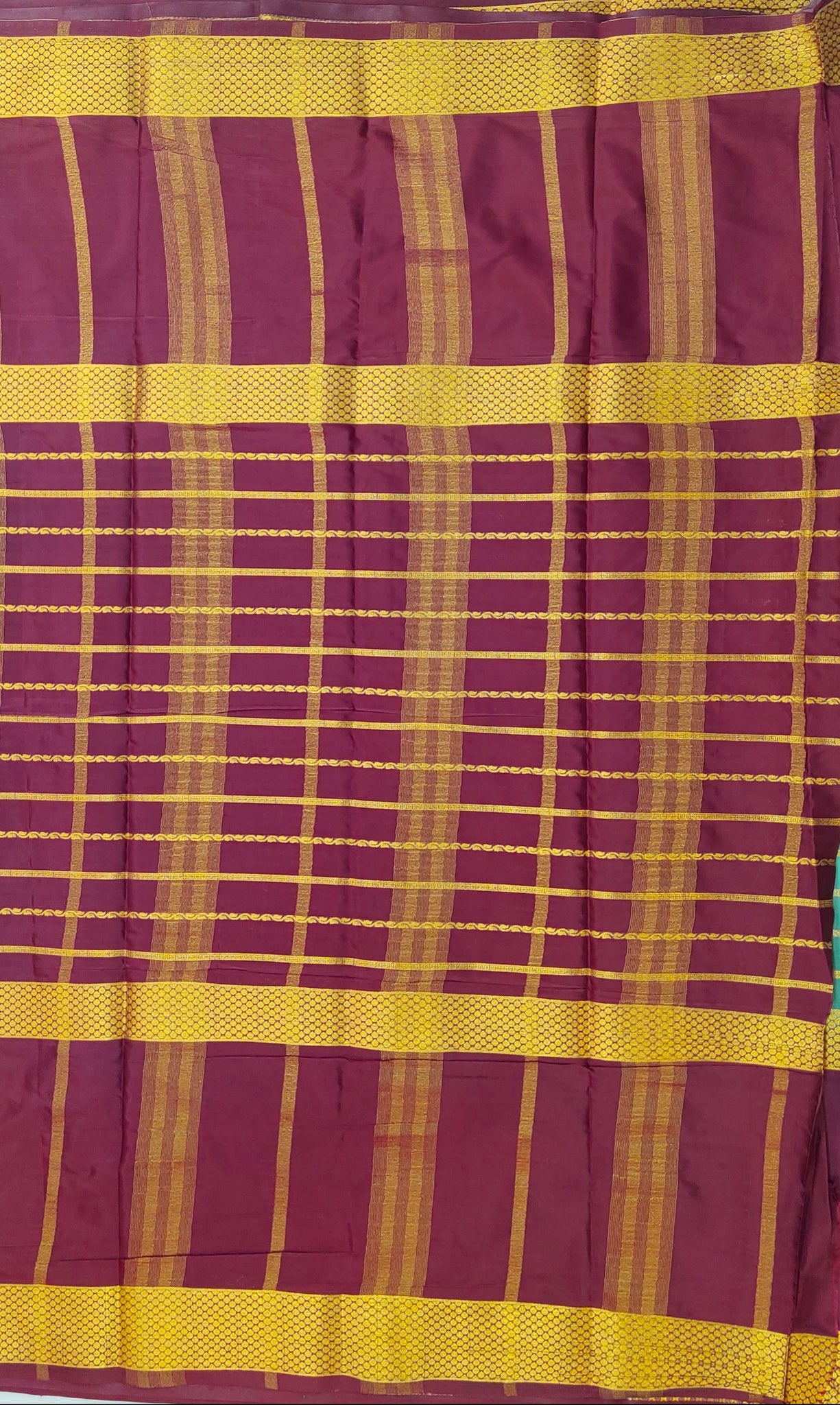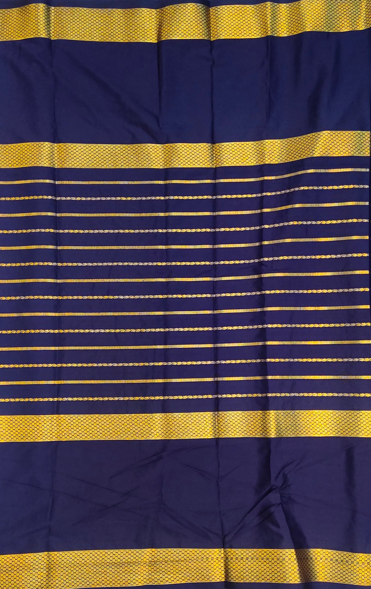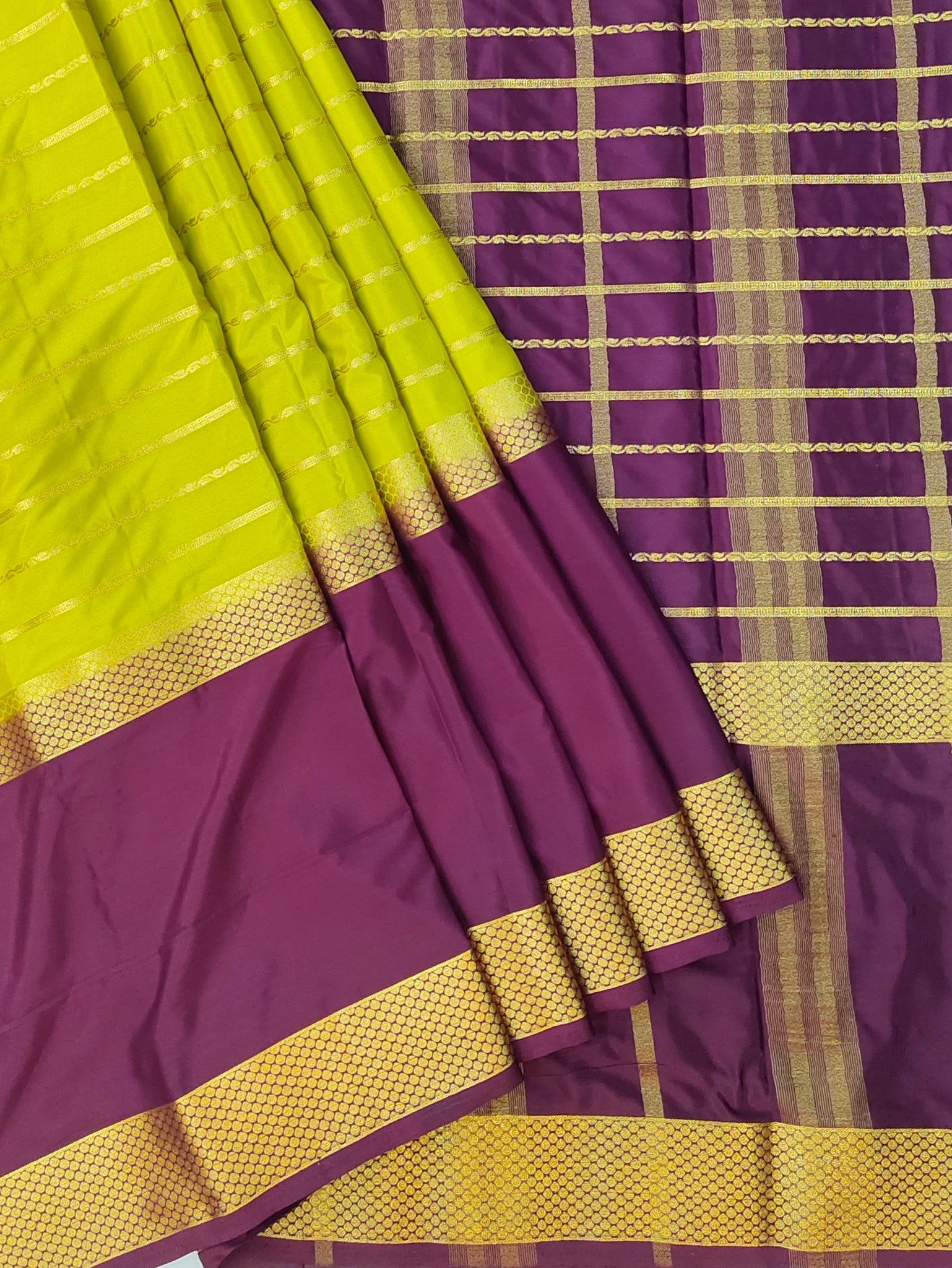 Indulge in the timeless elegance of our semi mysuru crepe Saree. Adorned with a contrasting border and blouse, this saree features a stunning striped body that exudes sophistication. Its luxurious fabric and intricate design will make you the center of attention at any event. Elevate your style with this exclusive piece.