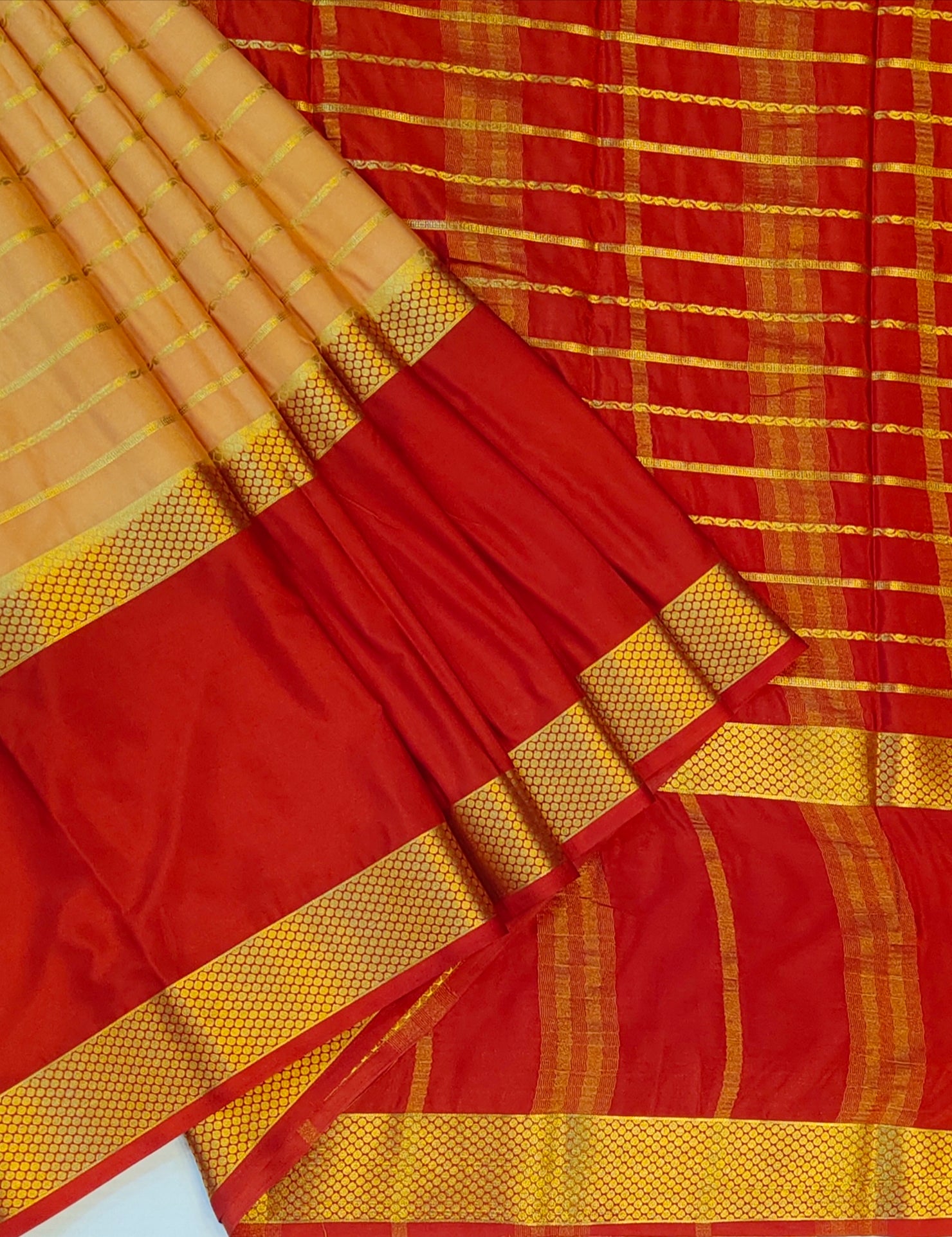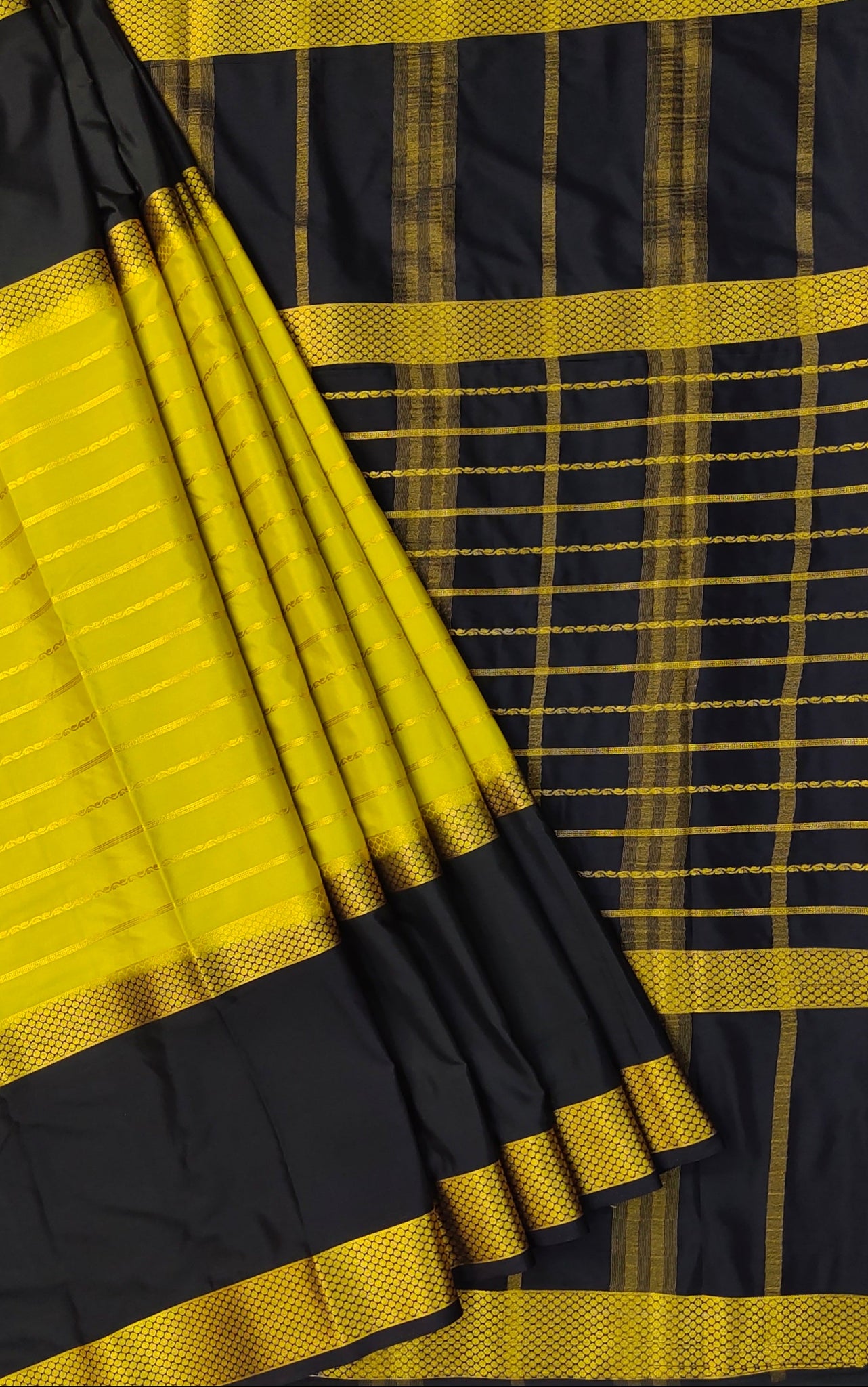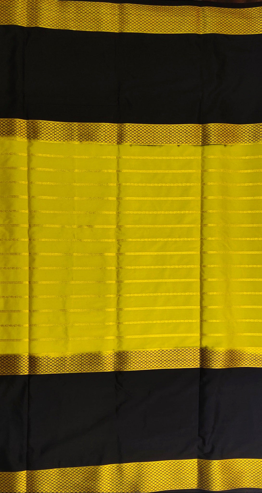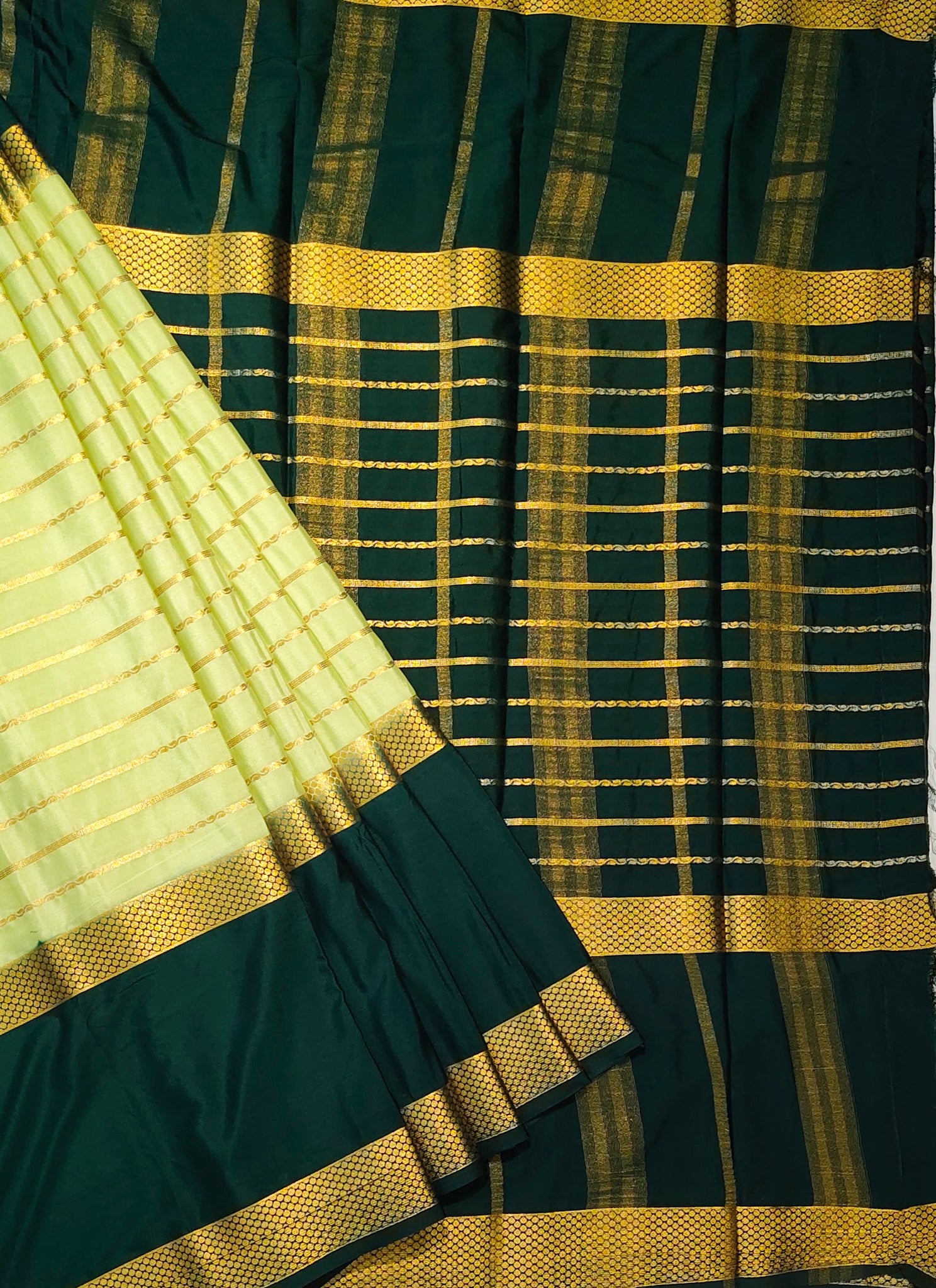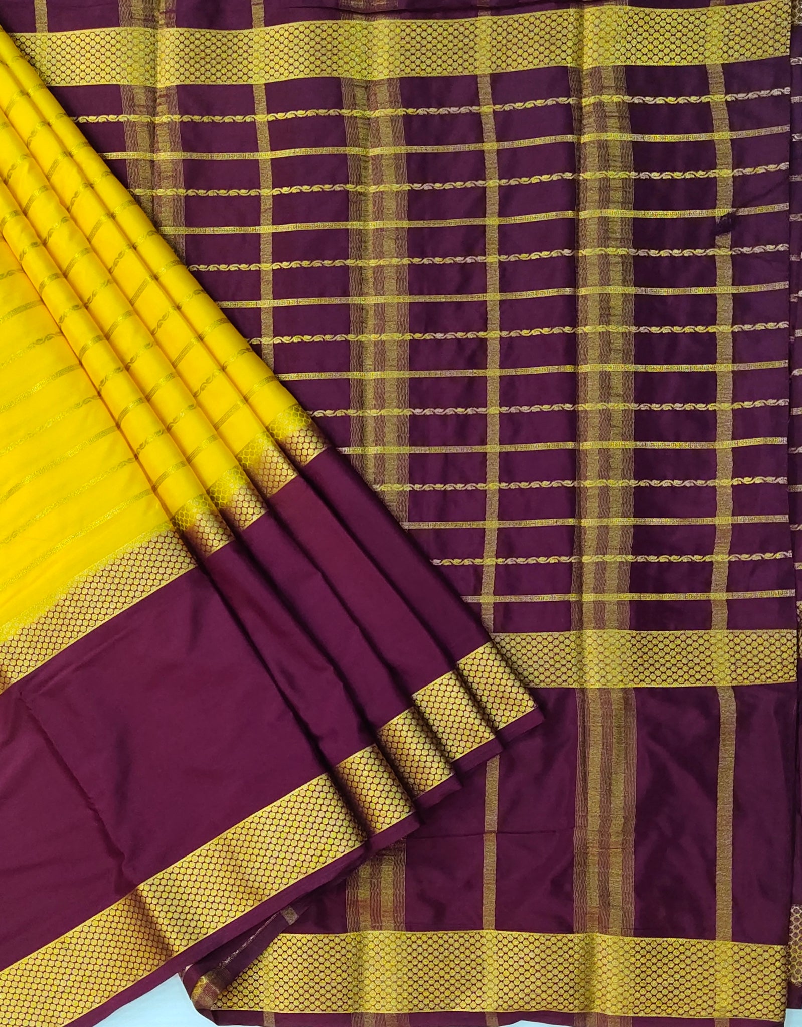 Indulge in the timeless elegance of our semi mysuru crepe Saree. Adorned with a contrasting border and blouse, this saree features a stunning striped body that exudes sophistication. Its luxurious fabric and intricate design will make you the center of attention at any event. Elevate your style with this exclusive piece.
