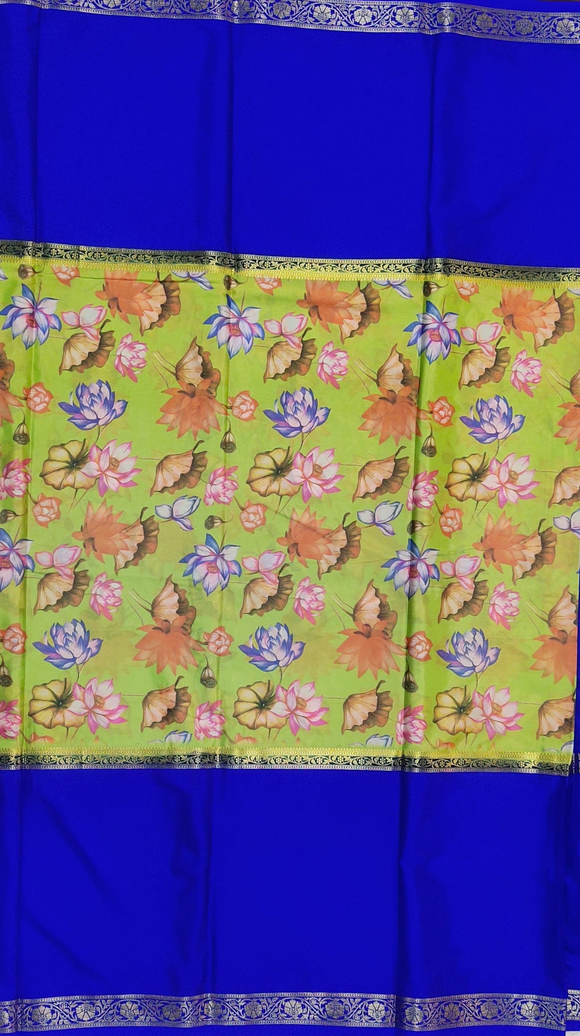 Indulge in the epitome of sophistication with our Semi Mysuru Crepe Saree. The digitally printed body is adorned with a contrasting border and pallu, exuding elegance and exclusivity. Complete the look with the matching blouse for a truly luxurious experience.