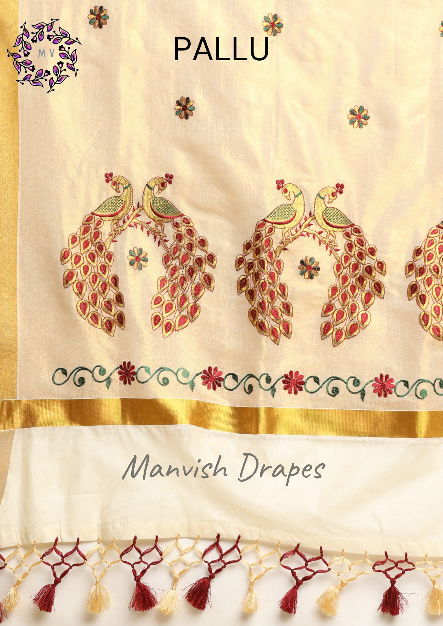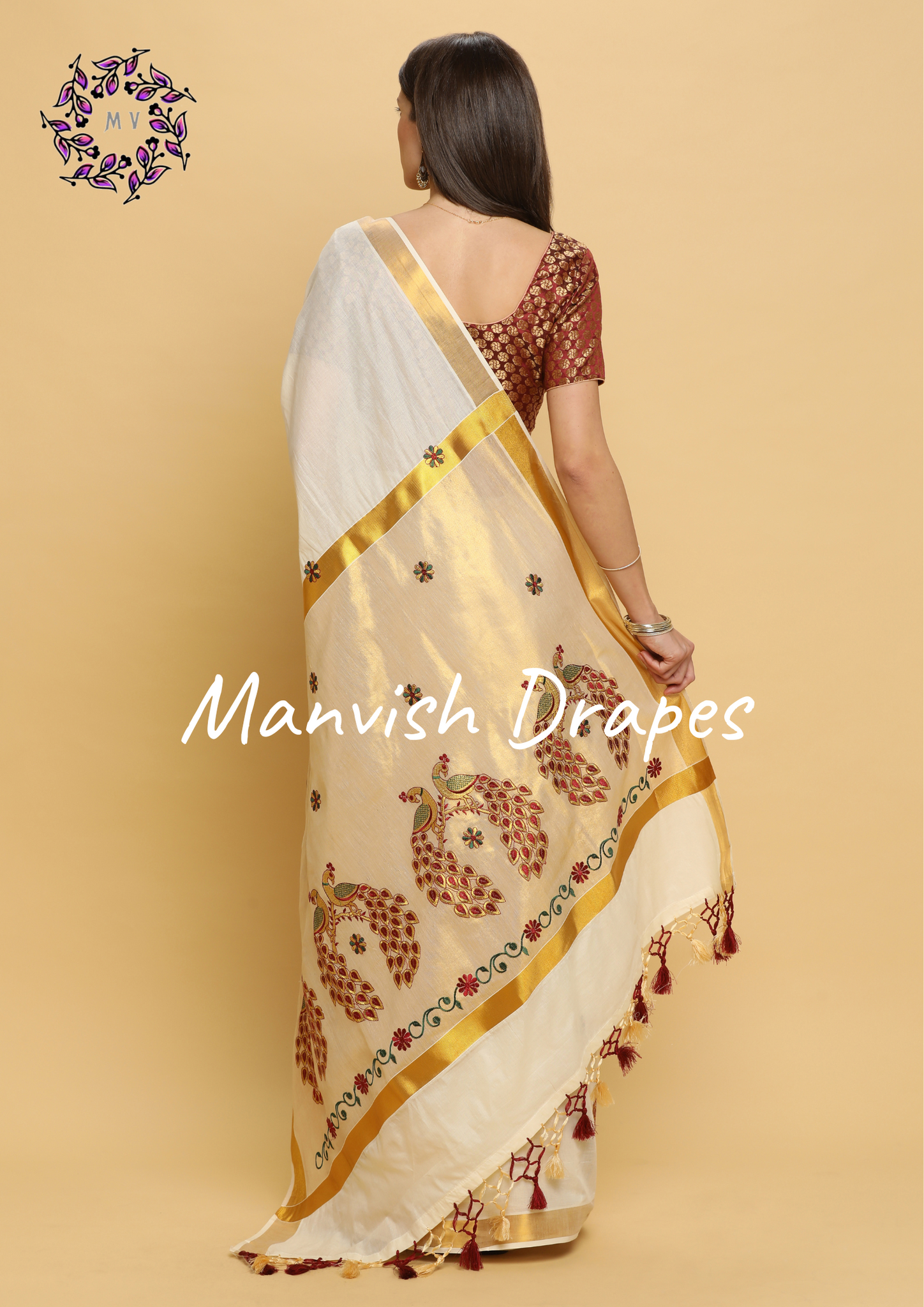 This majestic Kerala Kasavu saree is sure to turn heads with its timeless elegance. Crafted from pure cotton and boasting an intricate peacock embroidery, it's perfect for any traditional Kerala occasion. The off-white hue exudes a chic appeal that will have you looking your best.