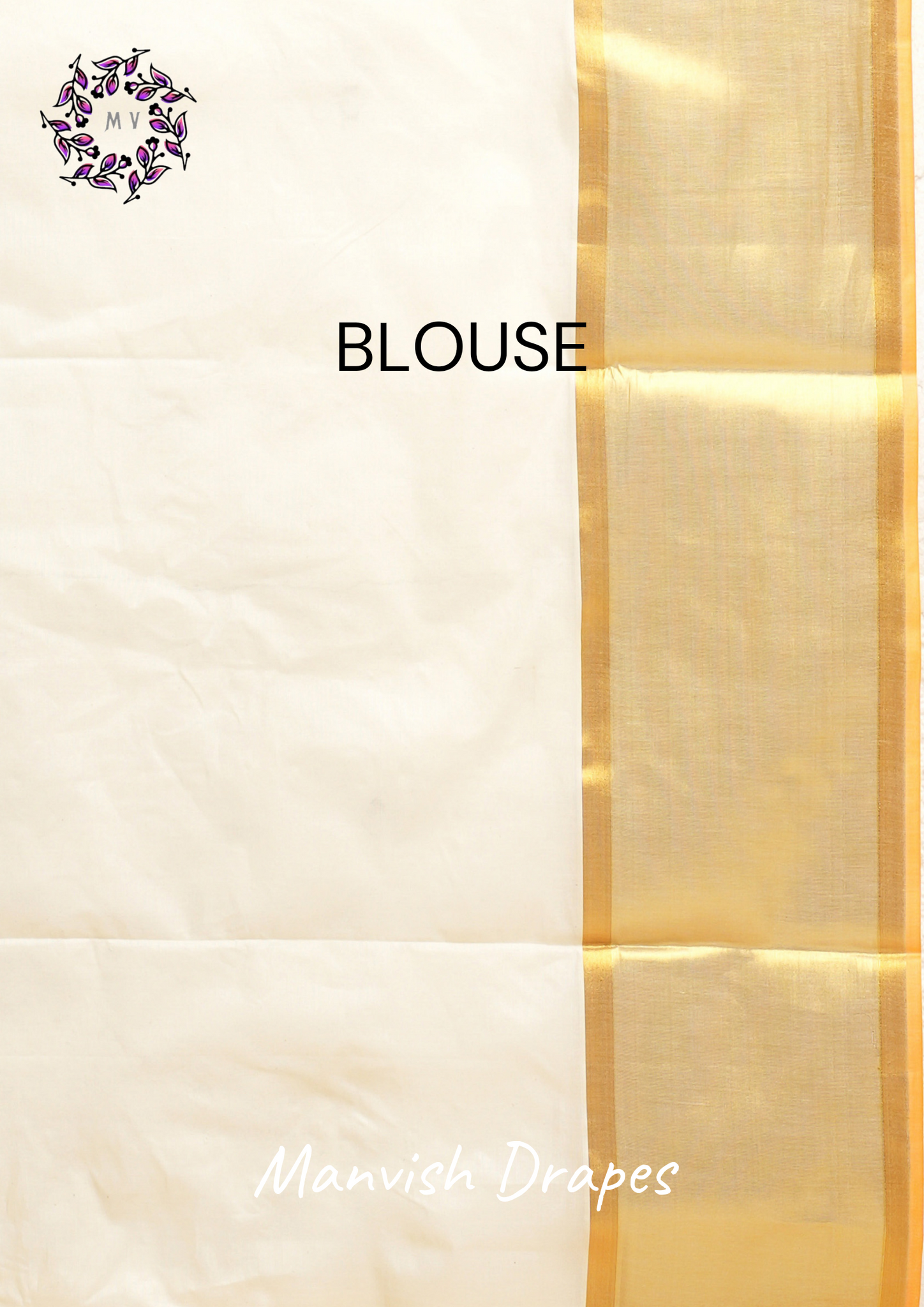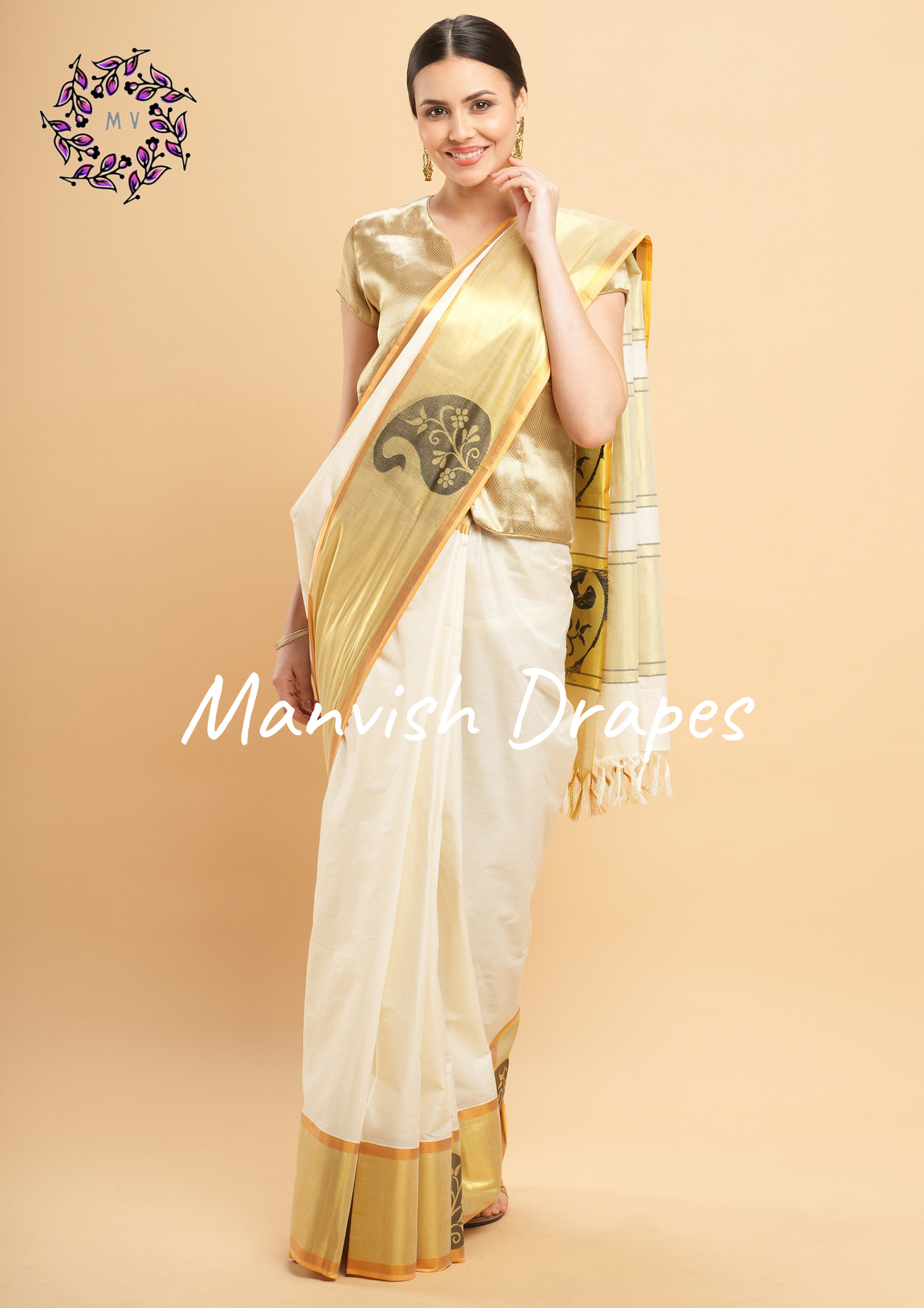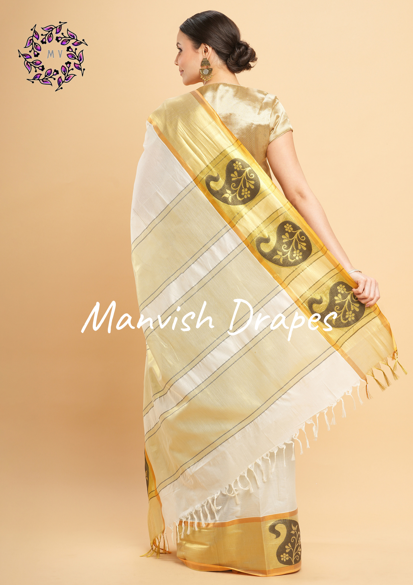 Plain Kerala Kasavu Pure Cotton Saree with Tissue Woven Border (BLACK BUTTA)